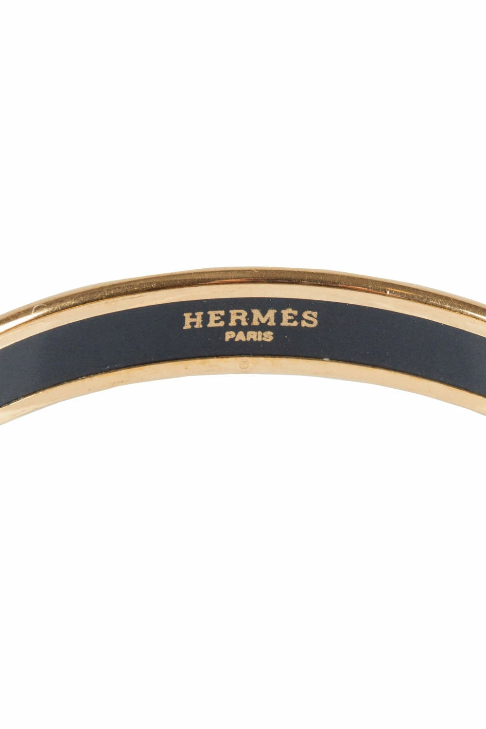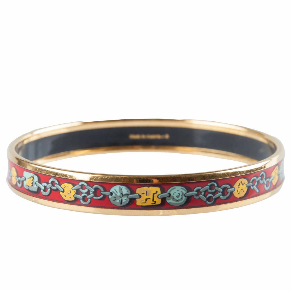 Beautify your wrist with this stunner of a bracelet from Hermes. The piece has been crafted from gold-plated metal and designed with enamel coating all around the exterior that features a multicolored chain print. This bracelet is complete with the iconic label on the inside of the band.