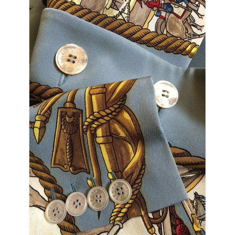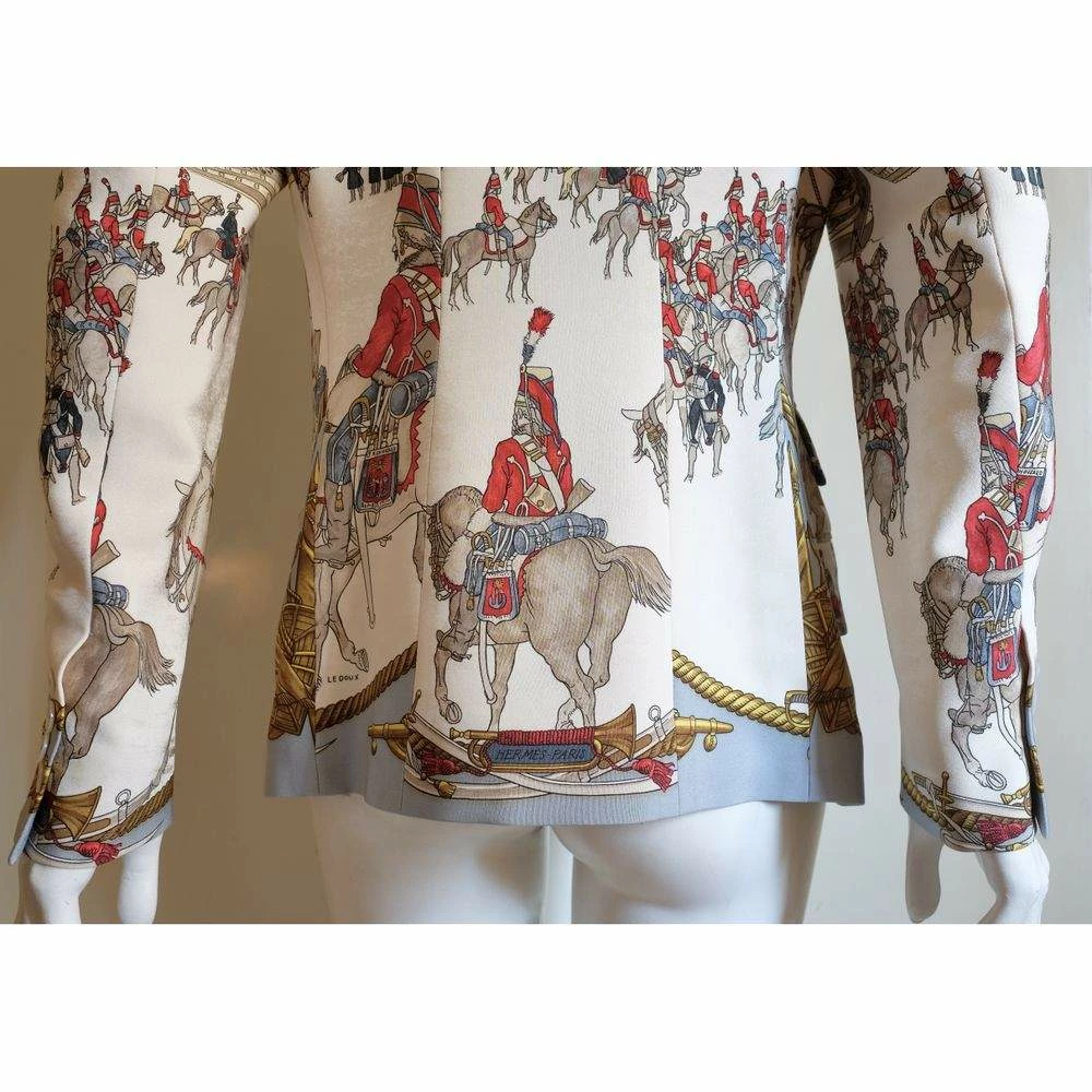 This stunning Hermes blazer evokes all elegance and chicness. Made from luxurious silk, this multicolor piece features the Foulard pattern “Marine Et Cavalerie” designed by Master Philippe Ledoux. Defined by six central mother-of-pearl buttons logoed with Hermes Paris, two side pockets, and one outer pocket with a flap, this fully lined jacket can work for all kinds of rendezvous.