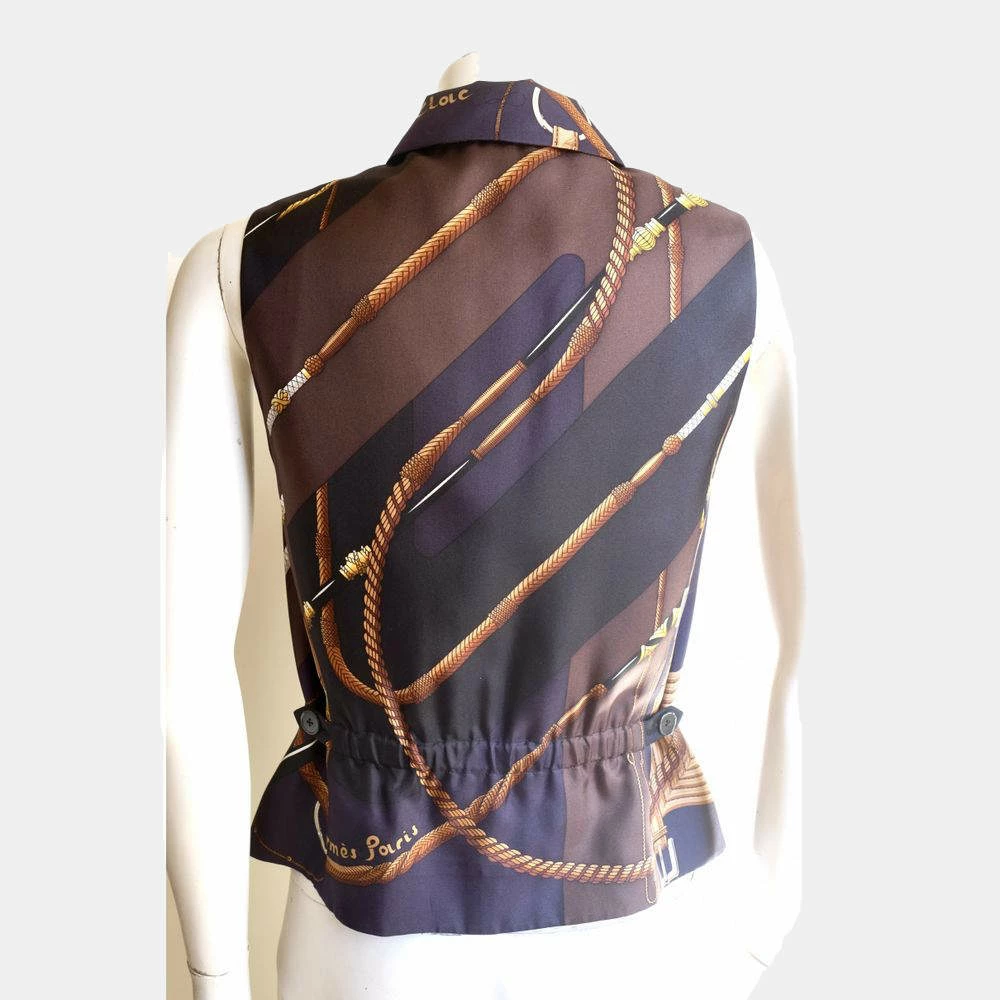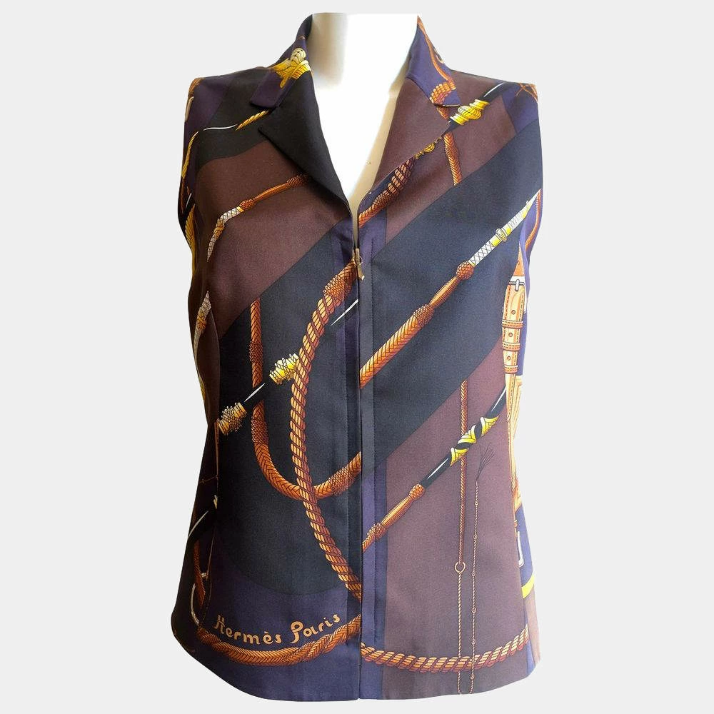 This gorgeous Hermes Gilet vest won’t let you down for fashionable events or birthdays alike. Made from luxurious silk, this multicolor piece features the “Click Clac” Foulard pattern designed by Master Julia Abadie. Accented with a zipper, this piece will look cool paired with a skirt and leather boots.