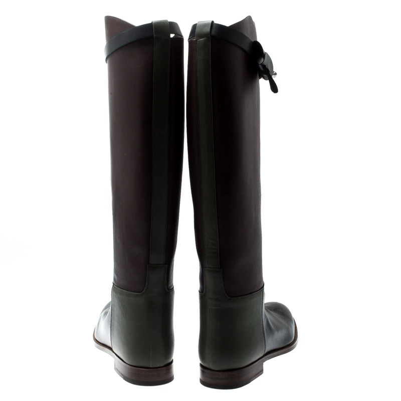 Create the most luxurious and stylish winter looks with these Hermes knee-high Jumping boots that are hard to miss. Constructed in multicolored leather featuring a patchwork design, these boots feature palladium-plated, iconic Kely lock-detailed straps around the topline to keep them secured. With a round toe and smooth lining, these boots are complete with sturdy outsoles and low heels.