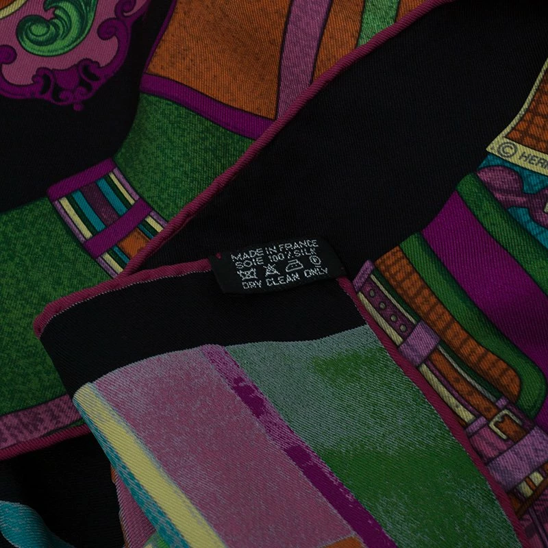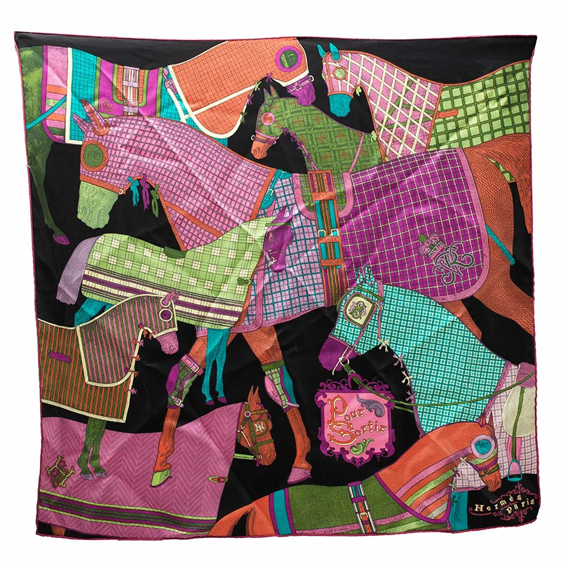This pocket sized Hermes Pour Sortir scarf is the perfect accessory for your wardrobe. Made from pure vintage silk, its smooth texture is designed to represent classic Hermes touch. The print represents horses with vibrant colored graphic patterns on black background.