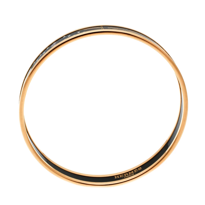 Beautify your wrist with this stunner of a bracelet from Hermes. The piece has been crafted from gold-plated metal and designed with multicolored enamel prints all around the exterior. This bracelet is complete with the iconic label on the inside of the band.