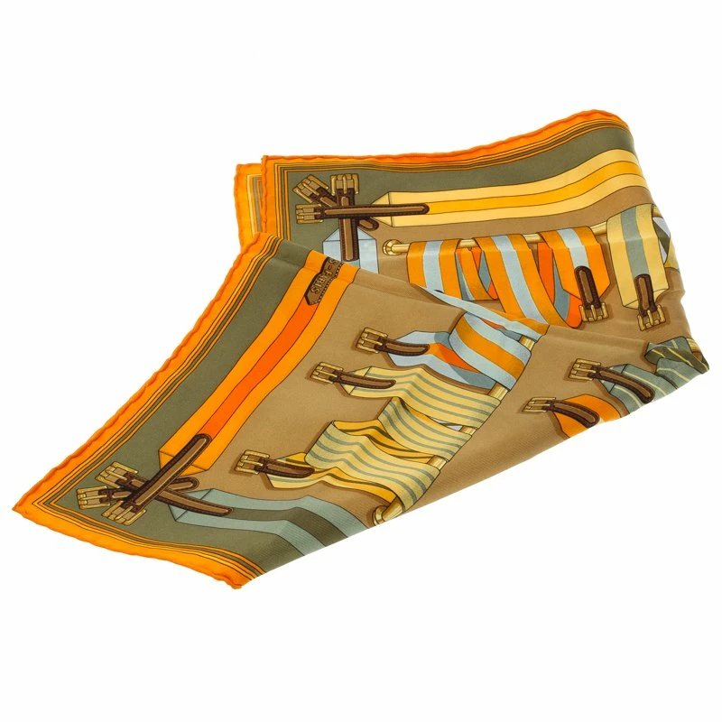 For the fans of Joachim Metz’s designs, presenting this iconic Les Sangles scarf by Hermes. The Joachim Metz design features the ribbons, strap and buckle details from his popular design from 1984 “Sangles”. The vibrant colors of orange, gold, brown and olive make this scarf a collectible. Wear it with your prefered suit.