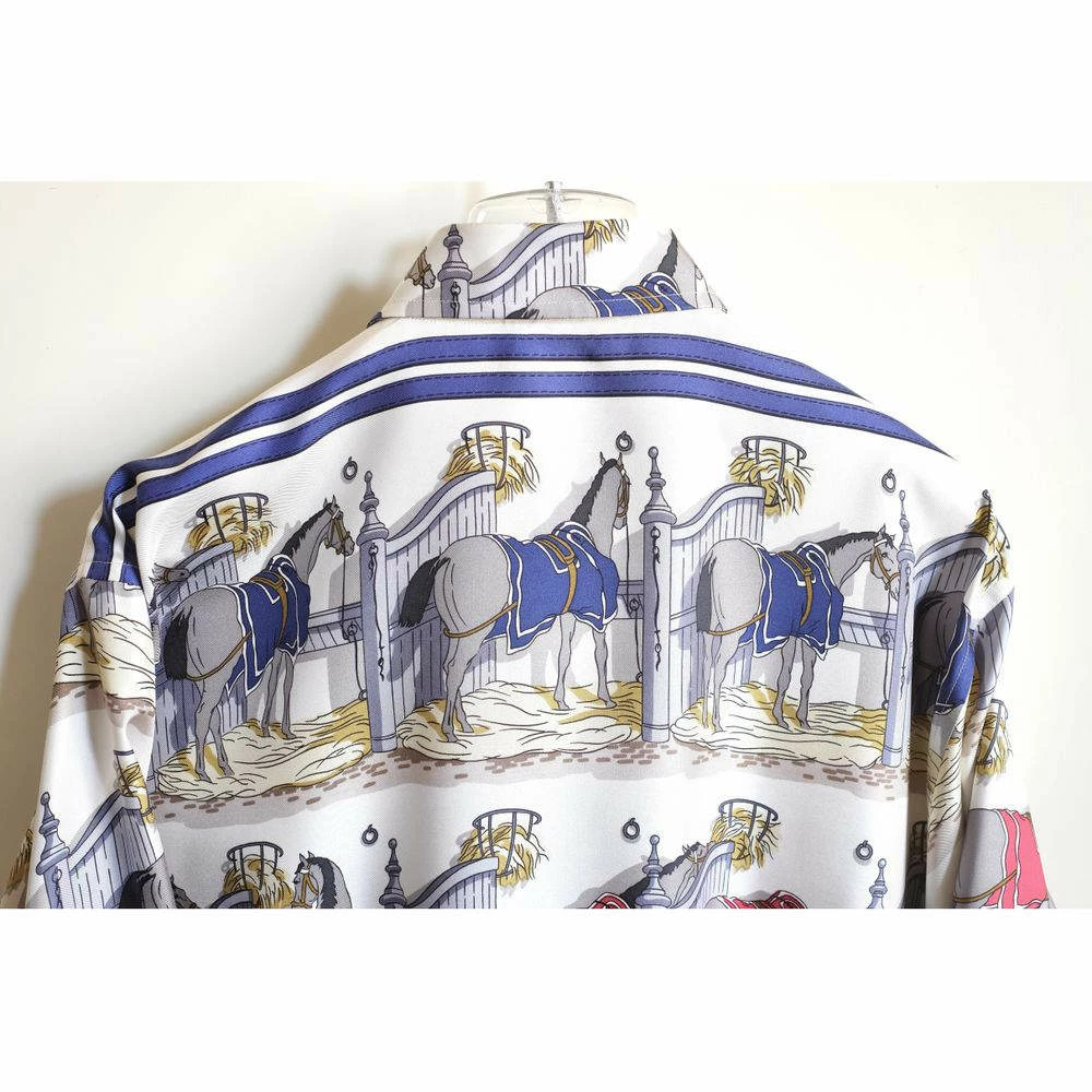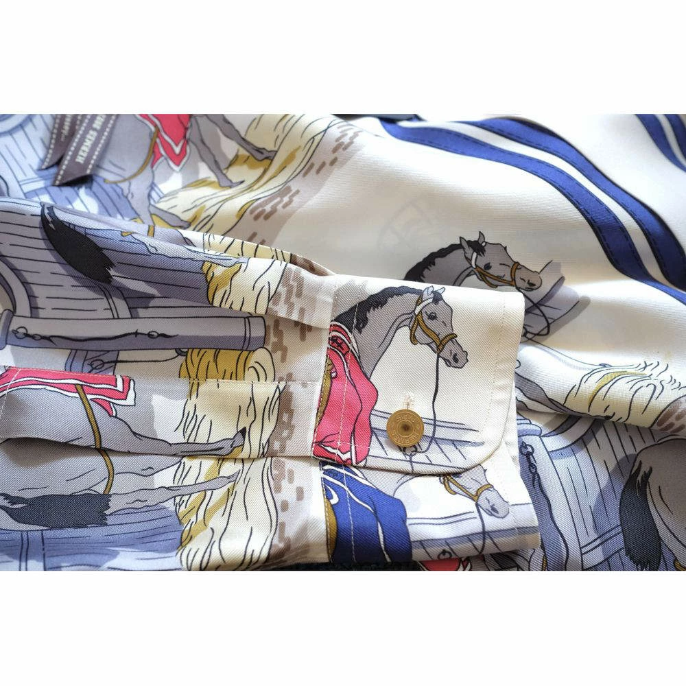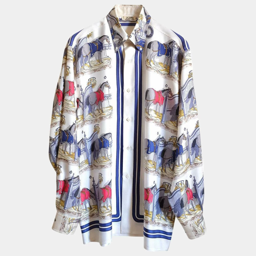 Gorgeous and unique, this Hermes shirt is truly a work of art. Fashioned in silk, this multicolor shirt features the “Ecuries” motif designed by Master Hugo Grygkar. Displaying vivid colors and equestrian design, this shirt comes with button cuffs in gold metal with the Hermes Paris logo.