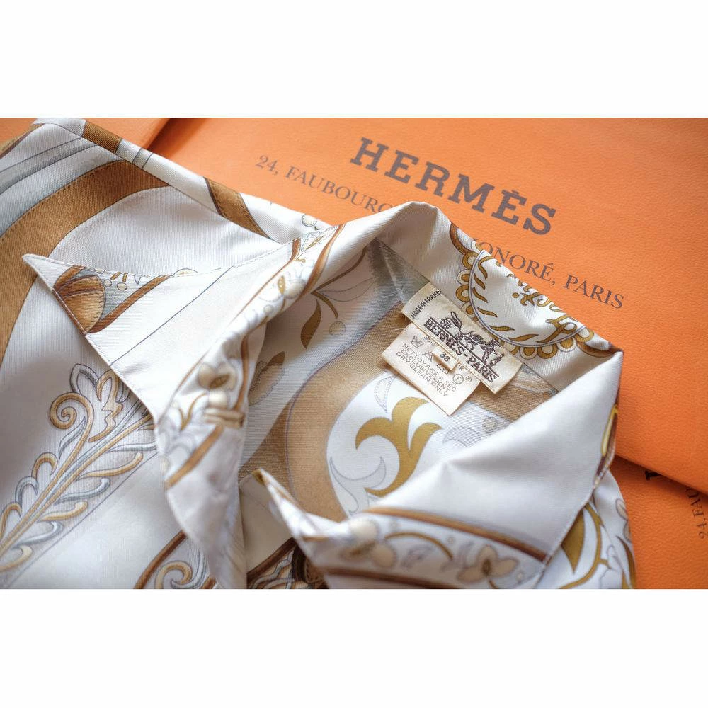 Add a luxurious touch to your ensembles with this fascinating Hermes shirt. Made from premium silk, this multicolor shirt offers a great fit that will accentuate your look. Featuring Carre “Festival” pattern designed by Master Henri D’Origny, this beautiful shirt is accented with mother-of-pearl buttons and the Hermes Paris logo.