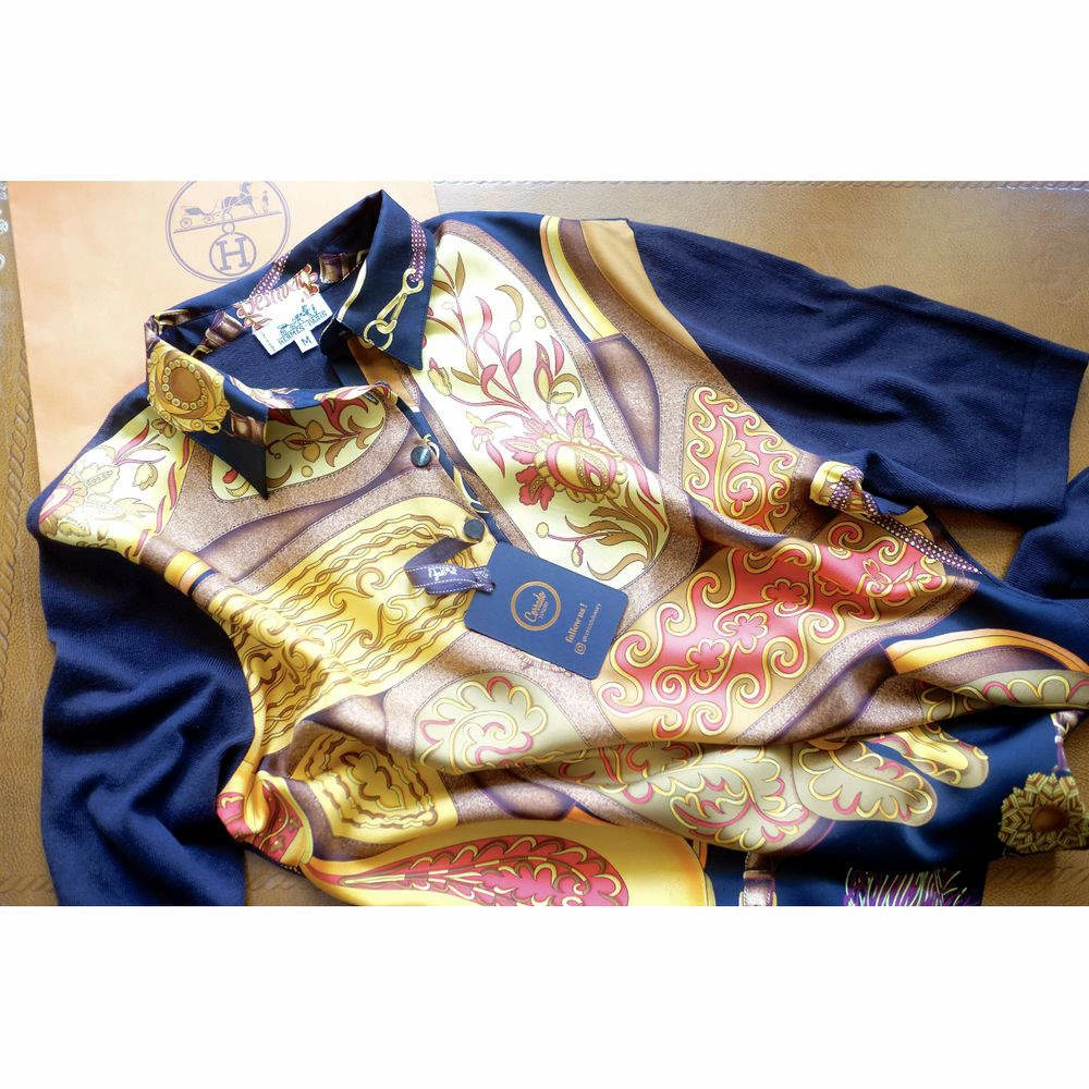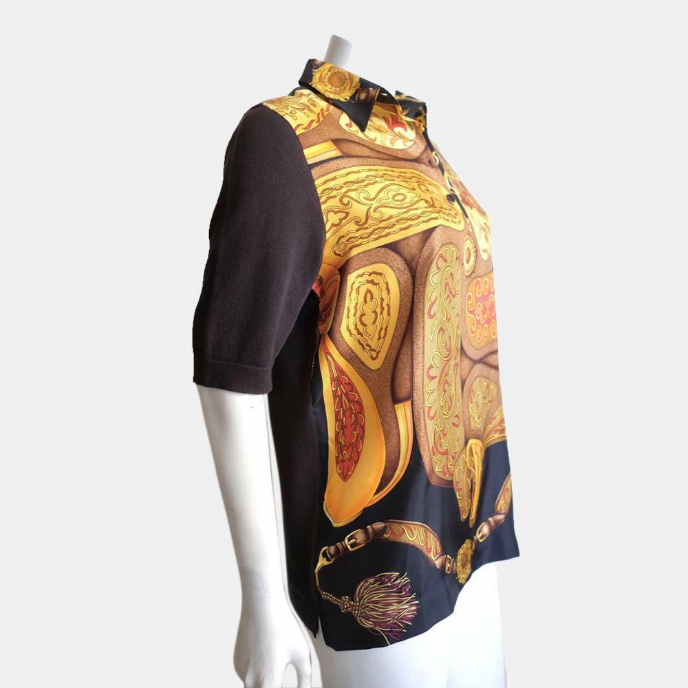 This elegant Hermes Vintage blouse will form part of your core wardrobe for seasons to come. Defined by short sleeves, this charming multicolor blouse is designed in silk and knit fabric. Featuring the Carre “Festival” motif, this shirt is accented with four logoed mother-of-pearl buttons.