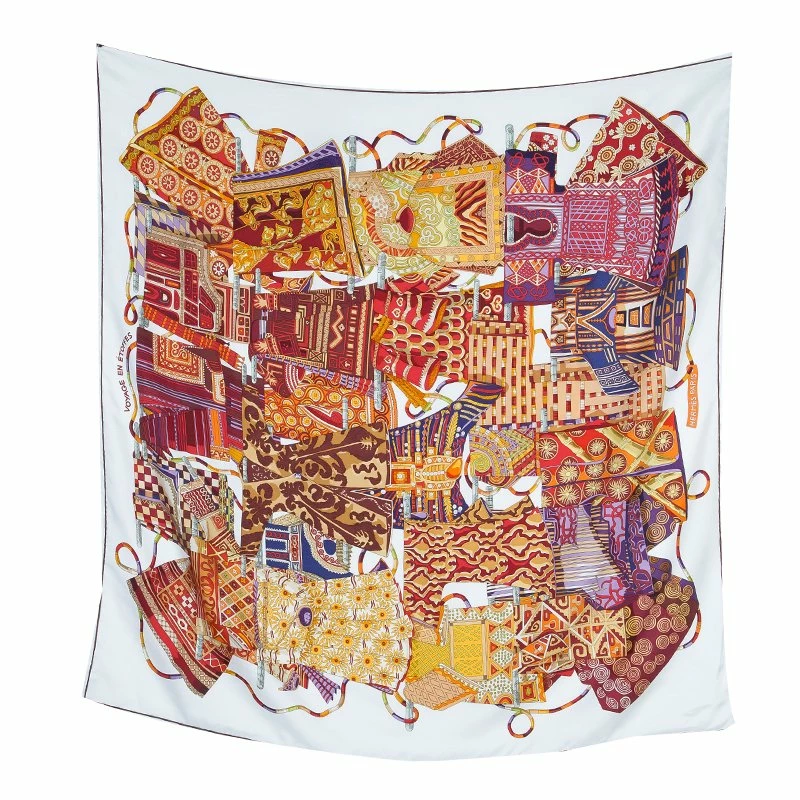 Off to travel? Carry the style along as you complement your amazing outfit with this exquisite scarf from the house of Hermes. It is crafted in silk. This Voyage En Etoffes scarf is square shaped and is a perfect way to travel fashionably!