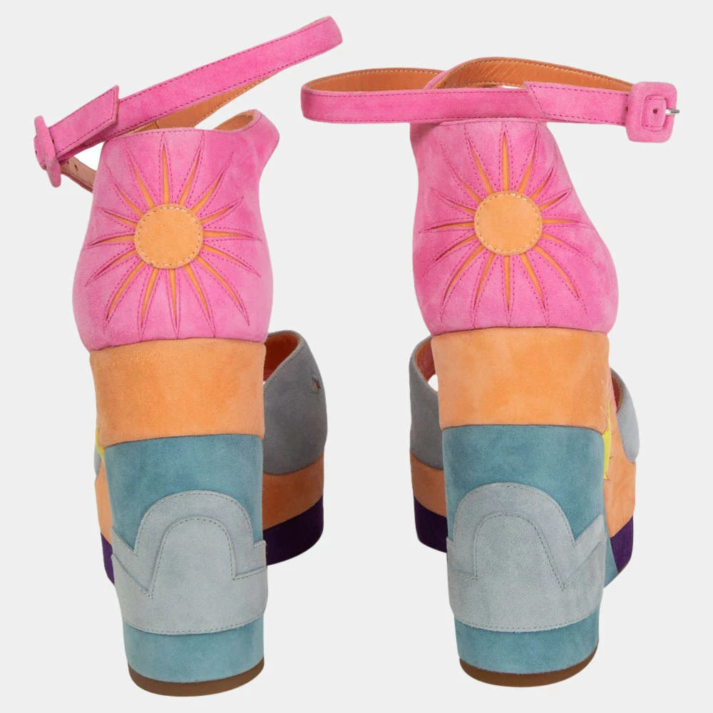 Looking to add a playful element to your everyday style? Go for these attractive Hermès Tournis wedges. Designed in pastel orange, yellow, blue, neon pink, and purple suede, this chic pair with its ankle-strap fastening and fun detailing will magically add vivid colors to your ensembles. Inside Sole: 25 cm (9.8 in) , Width: 7.5 cm (2.9 in)