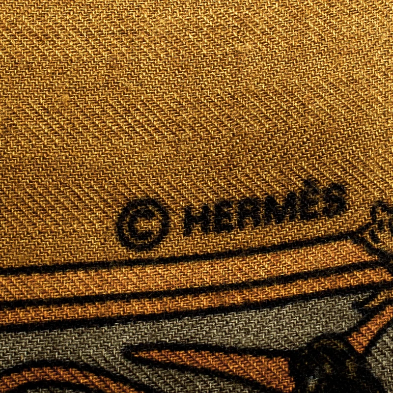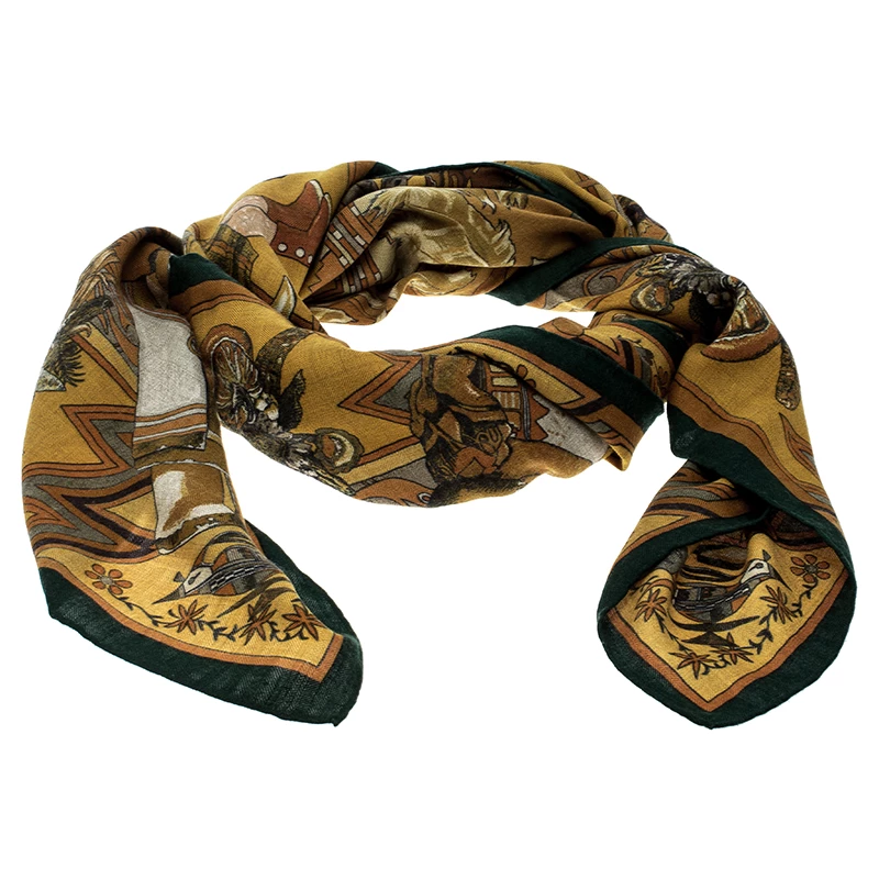 Crafted from a combination of mustard and green Cashmere and silk, this Kachinas scarf from Hermes will amp up any look. It is finished with rolled edges and looks best when styled with a monotone dress or blouse.
