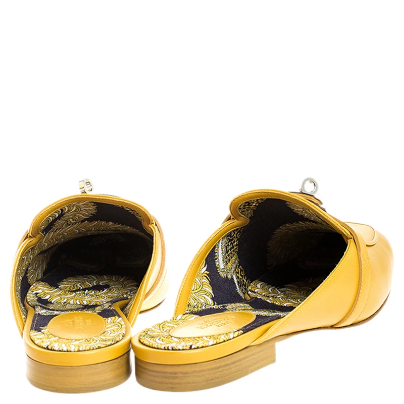 Designed in a loafer style, these mules are from the house of Hermes. They are beautifully crafted in bright yellow calfskin leather with the signature twist-lock in palladium-plated metal on the vamps. Slip these flat mules on for a comfortable urbane style.