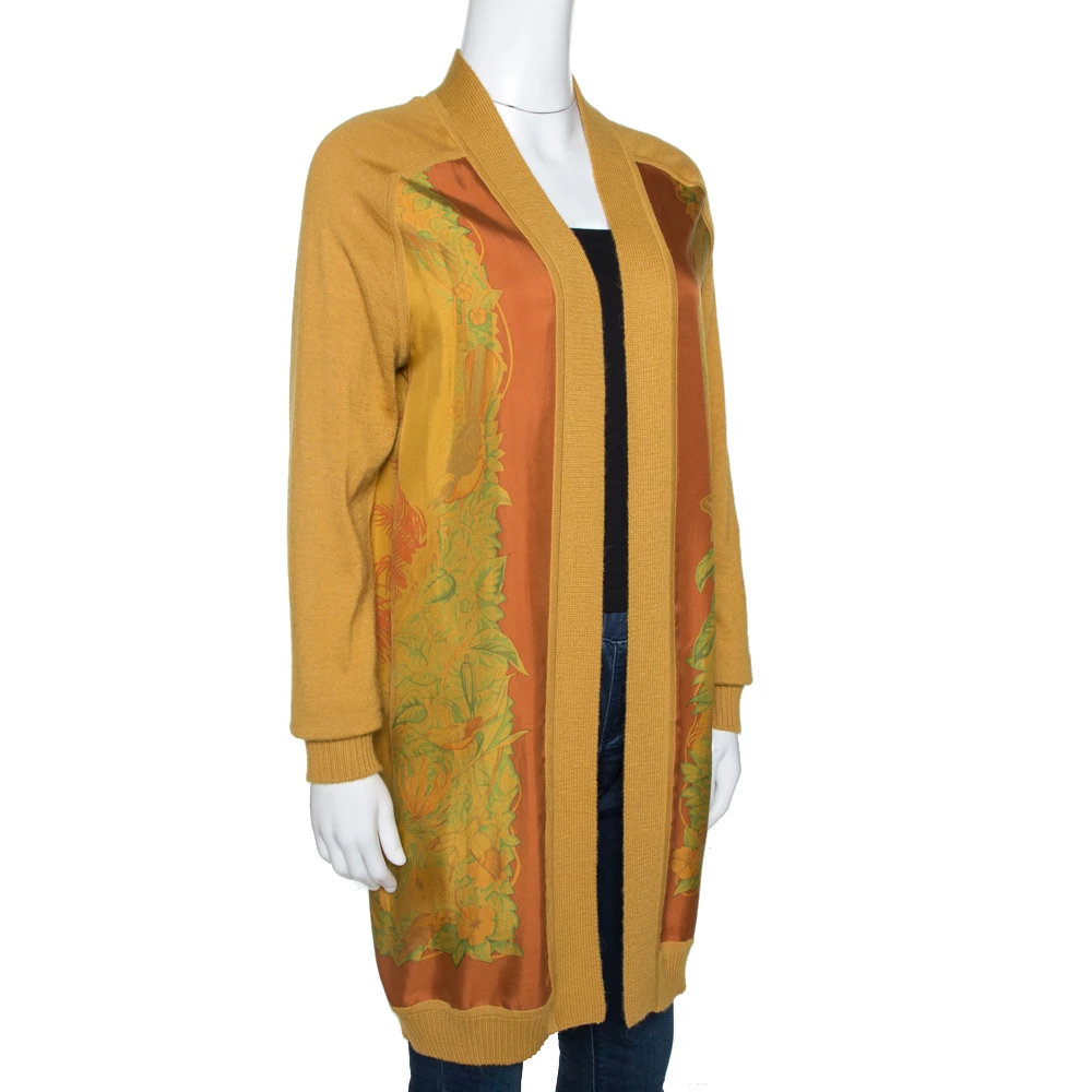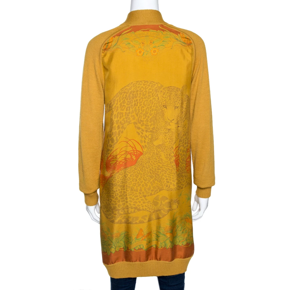 This fabulous cardigan from Hermes is a versatile creation that definitely deserves a place in your wardrobe! It is made of a blend of fine fabrics and features a lovely mustard shade all over. It flaunts a jungle print to the front and a log silhouette. Long sleeves and an open front complete this piece. Pair it with a solid-colored dress and boots for a chic appearance.