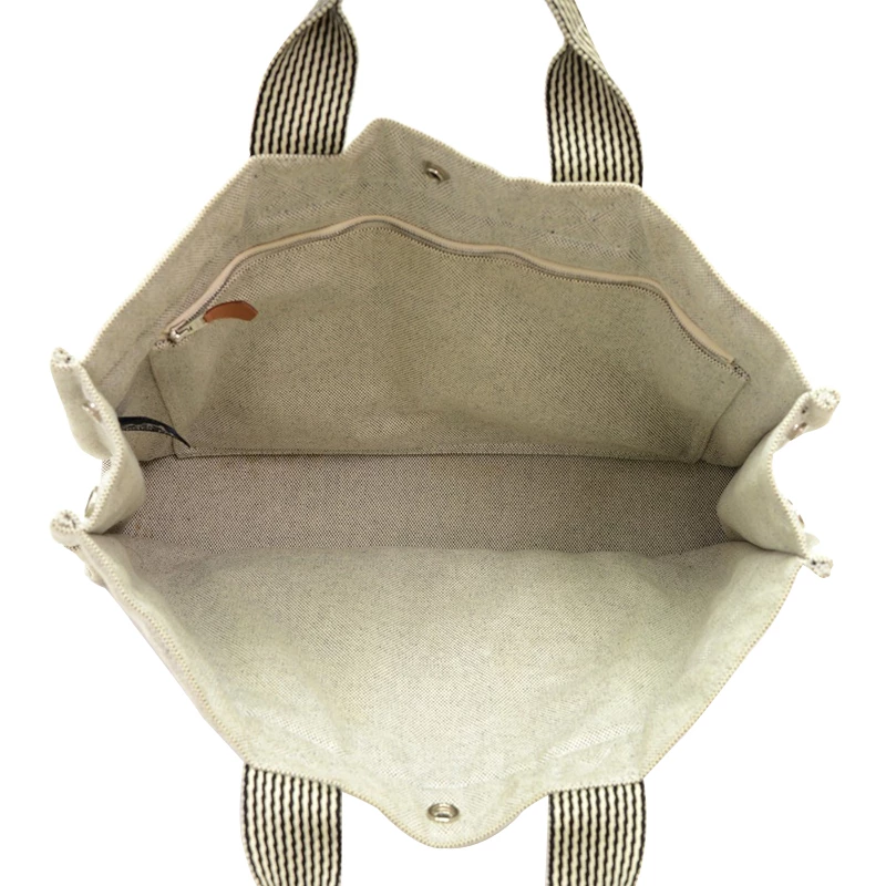 This Hermes Fourre-Tout tote is a practical and convenient classic that will hold your daily essentials. Made from a natural toile canvas, it features striped straps through front and back forming open pockets and extending to form double top handles. Expandable with its snap-enclosed sides, the bag is secured with a zip closure and an open interior with a fabric lining and patch pockets.