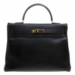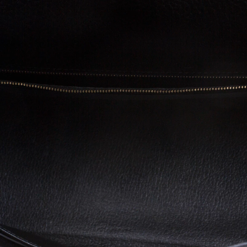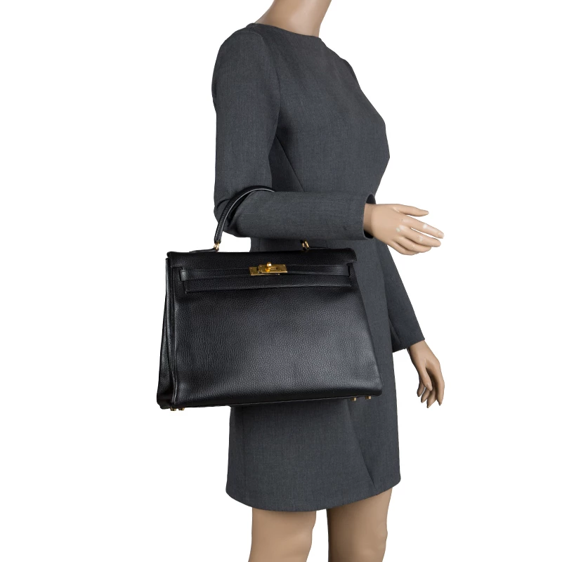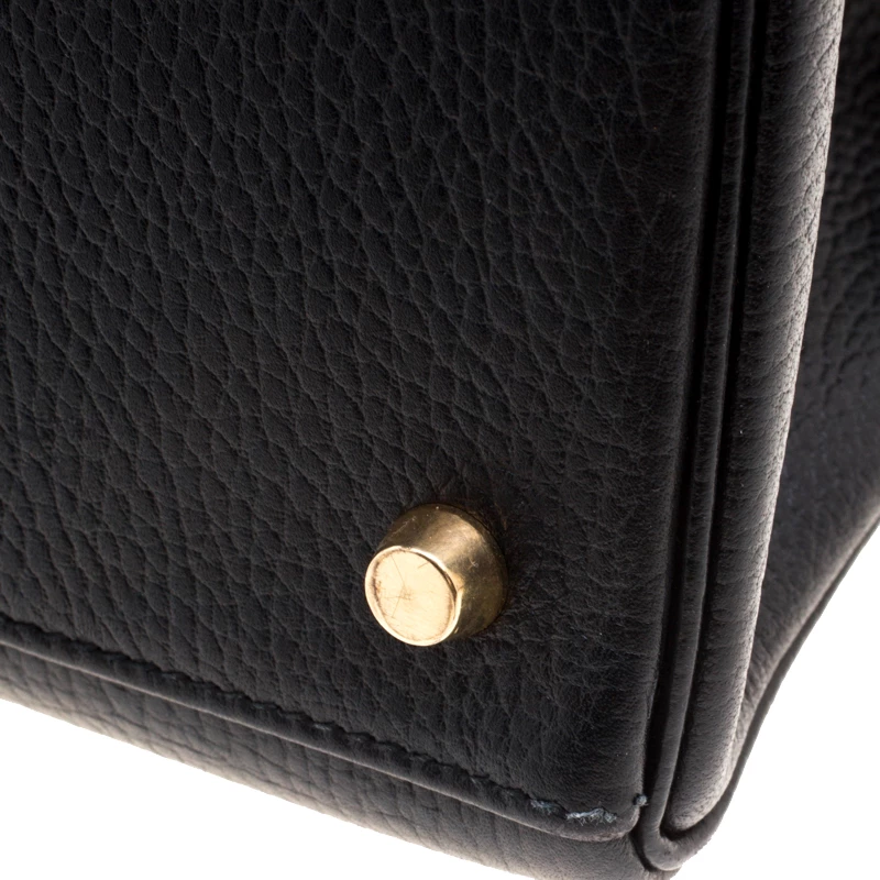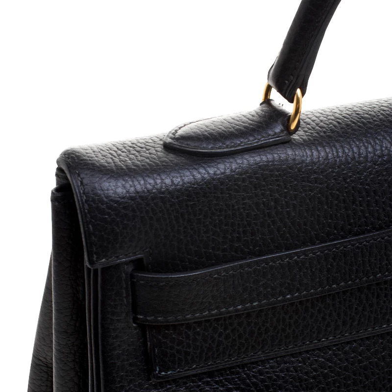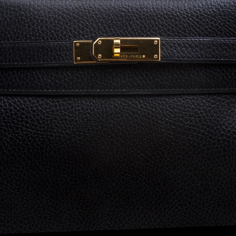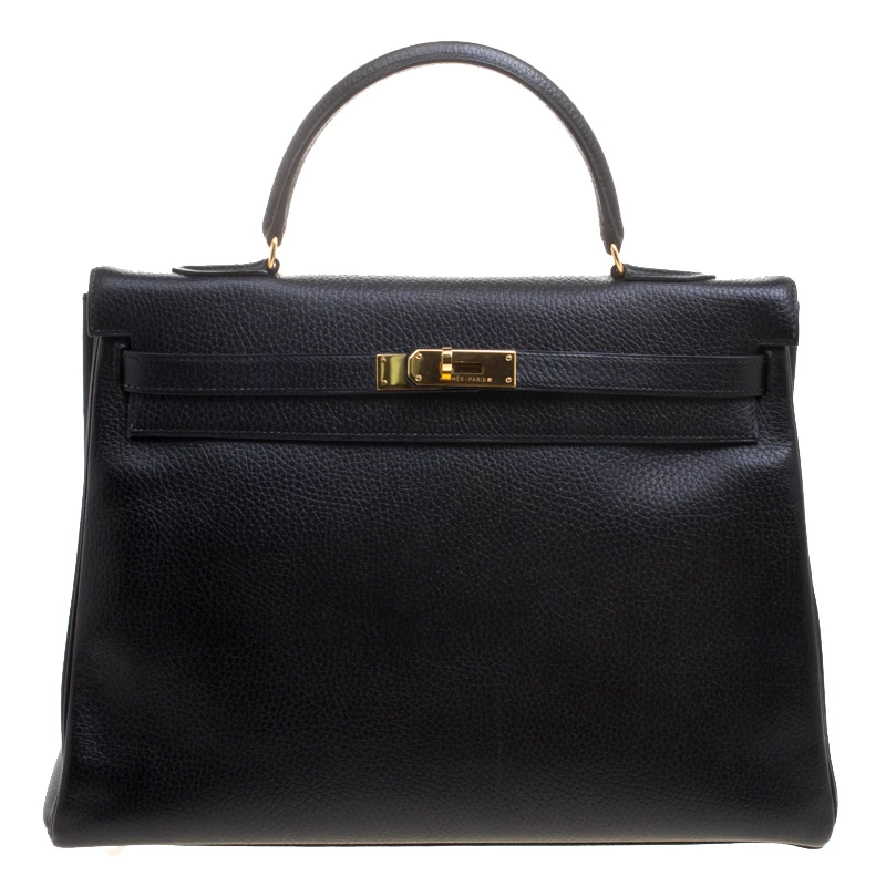 Styled for your everyday outings the famous Kelly 35 by Hermes will remain a must-have bag for years to come. This version is crafted from black Ardennes leather or Vachette Grainee des Ardennes and is no longer manufactured by Hermes. The processed and pressed leather takes its name from the Adrenne region in Northern France to Southern Belgium where male calf is raised. Owing to its sturdy qualities and shape- bearing structure this Kelly Retourne 35 is known to stand the test of times and has earned the synonym of a ‘work horse’. The classic exterior is detailed with a gold-tone twist lock closure and a polished lock. This iconic bag features keys and a leather lined interior.