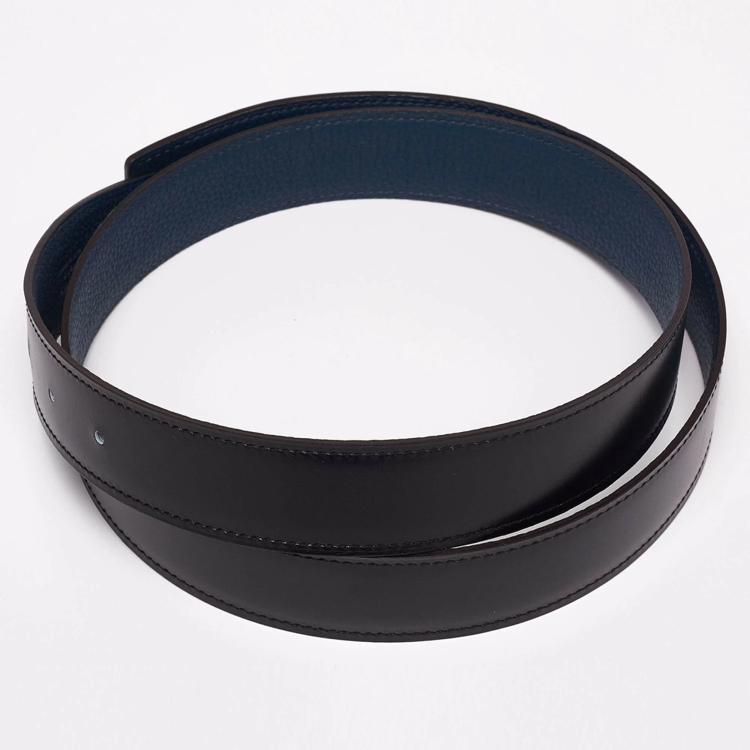 A classic add-on to your collection of belts, this Hermes belt strap has been crafted from leather in France. It has a reversible feature with a blue shade on one side and black on the other, and it will complement any buckle shape.