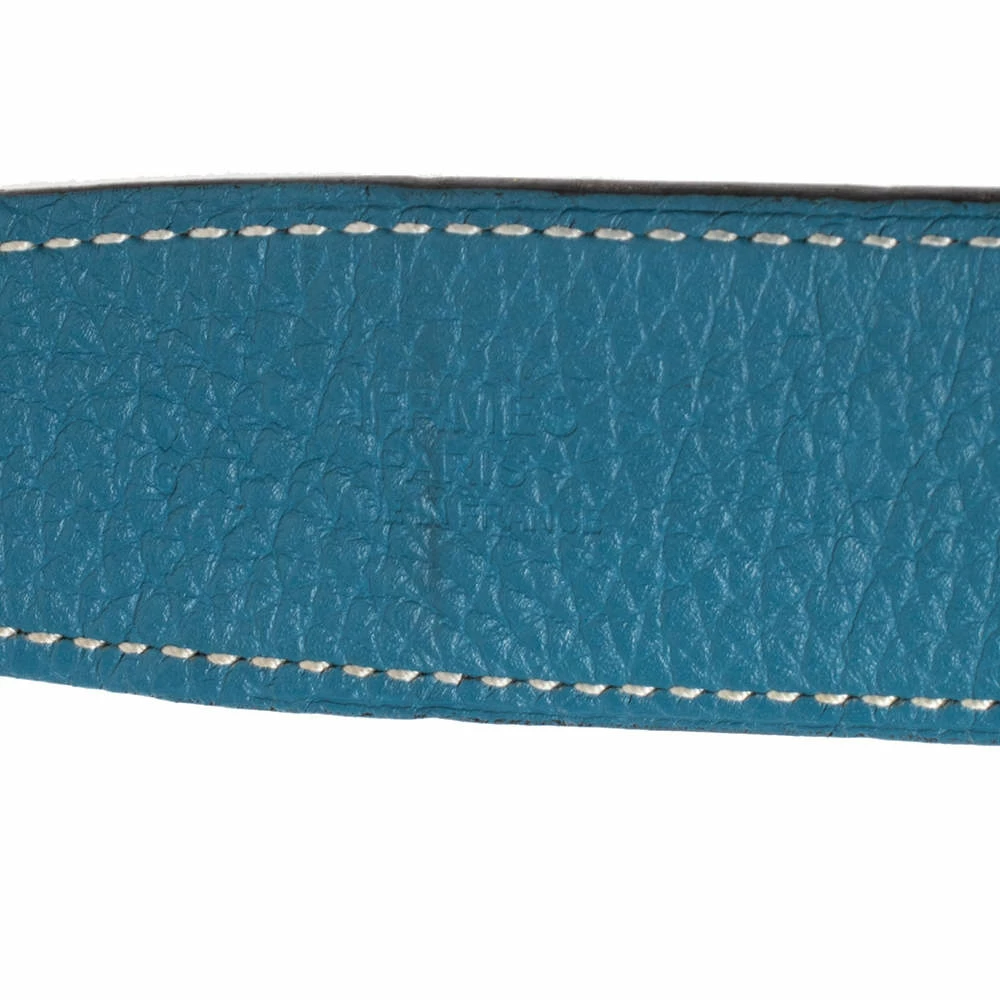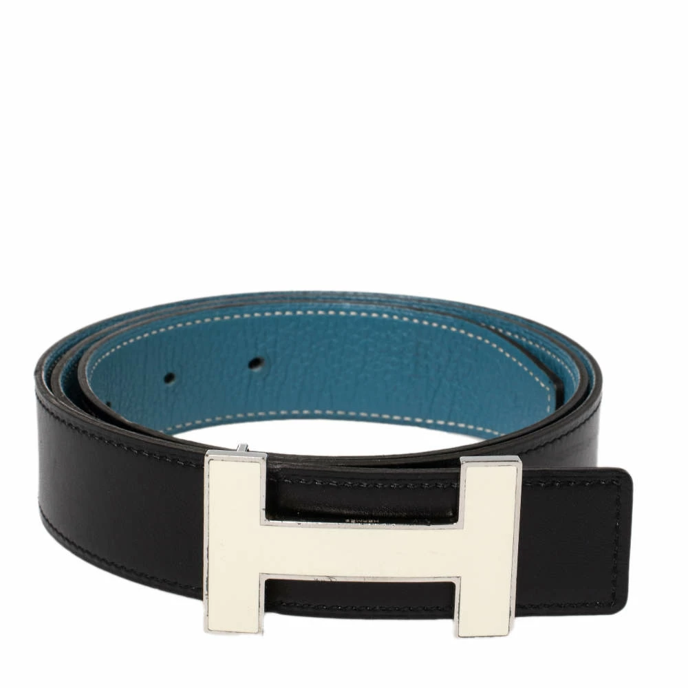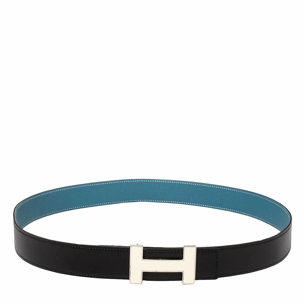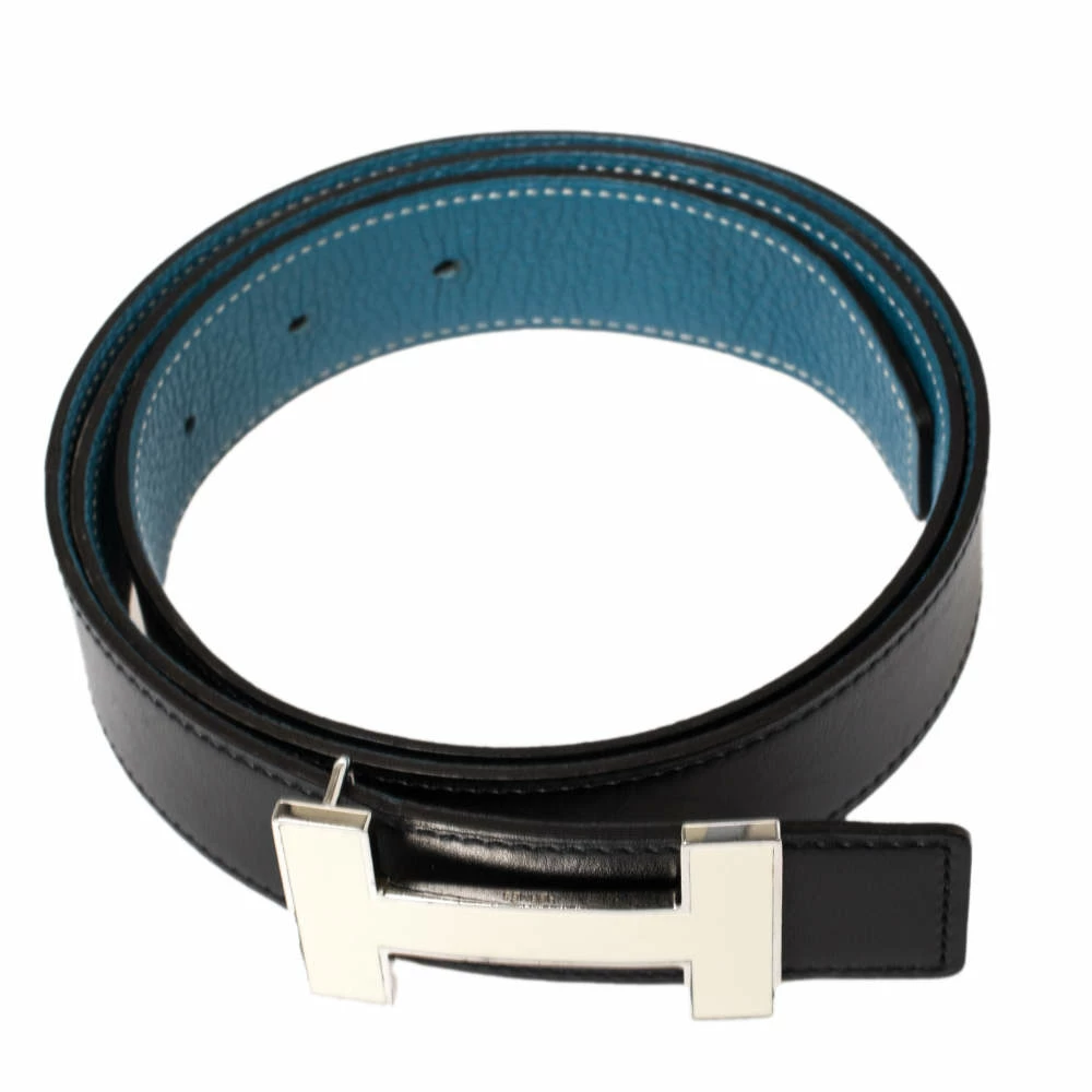 A classic add-on to your collection of belts, this Hermes piece has been crafted from Togo and Chamonix leather. It is reversible with a black shade on one side and blue on the other. It is topped with an H buckle in palladium-plated metal. This wardrobe essential piece will continually complement your style.