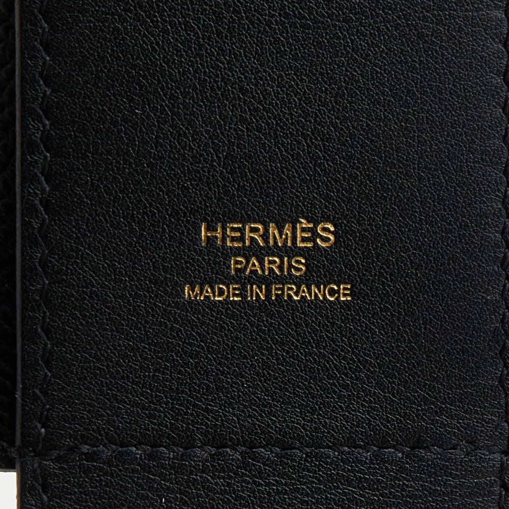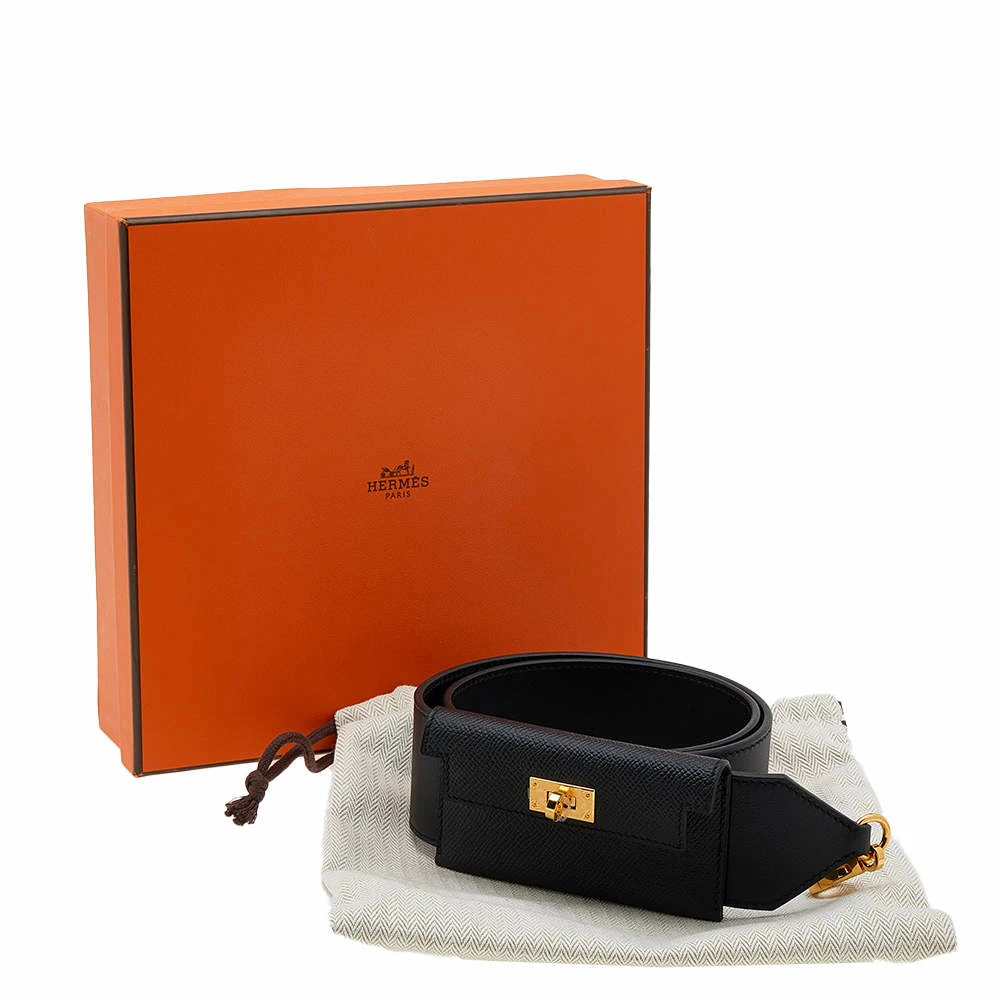 Hermes bag strap in Noir Swift/Epsom leather with gold-tone metal clasps. The flat strap is attached with a small twist-lock pouch to hold cards. Complement your prized Hermes bags using this accessory.