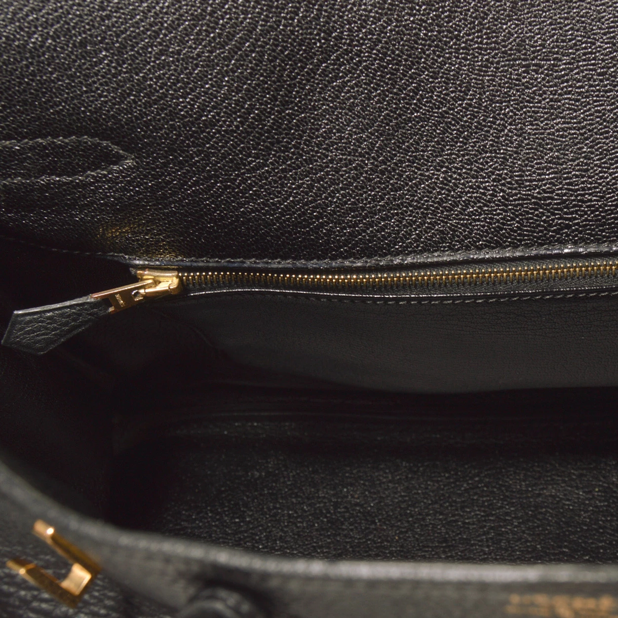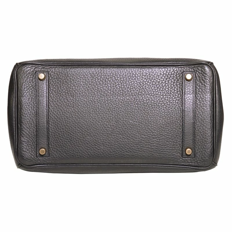 Birkin 35 bag by Hermes is a signature bag under the label’s opulent creations. Crafted from black leather, it is accented with gold-tone hardware and features dual top handles. The signature turn lock closure opens to a leather lined interior that houses a zipper pocket. This bag will effortlessly enhance your formal elegance. It comes with a padlock, a key and a swinging clochette.