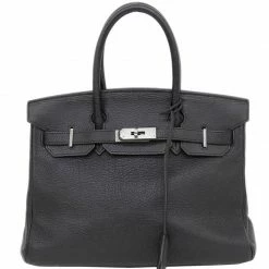 The carry-all solution to all your accessorizing woes, this classy black Birkin bag from the house of Hermes is a stylish addition to your wardrobes for a swanky look about town. Characterized by a luxurious palladium-plated swivel lock clasp, the bag, crafted from premium quality Togo leather into a trapeze shape, features a smartly designed interior with two pockets where you can neatly organize your belongings for convenience and ease. Attached with two rolled leather top handles, the bag can be carried anywhere for a look of classy sophistication.