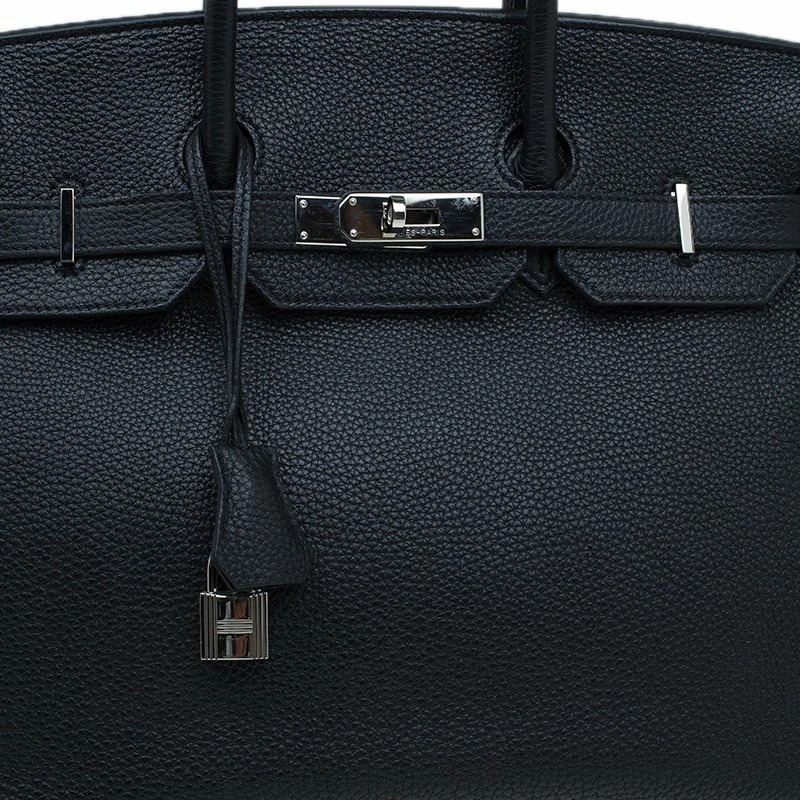 Hermes Birkin was inspired by Jane Birkin and is one of the most desired handbags in the world. A timeless classic that never goes out of style. Handcrafted from the highest quality of leather by skilled artisans, it takes over 18 hours of rigorous effort to stitch a Birkin together. Crafted in France from Noir Togo leather, the bag features dual top rolled leather handles, a padlock, and a clochette. The bag comes with silver-tone hardware and has a spacious leather lined interior that houses a slip pocket. Birkin 35 can hold your daily necessities and more. High quality and flawless craftsmanship are synonymous with Hermes. There has never been a Birkin that was not gorgeous, invest in this collectible as it retains its value year after year.