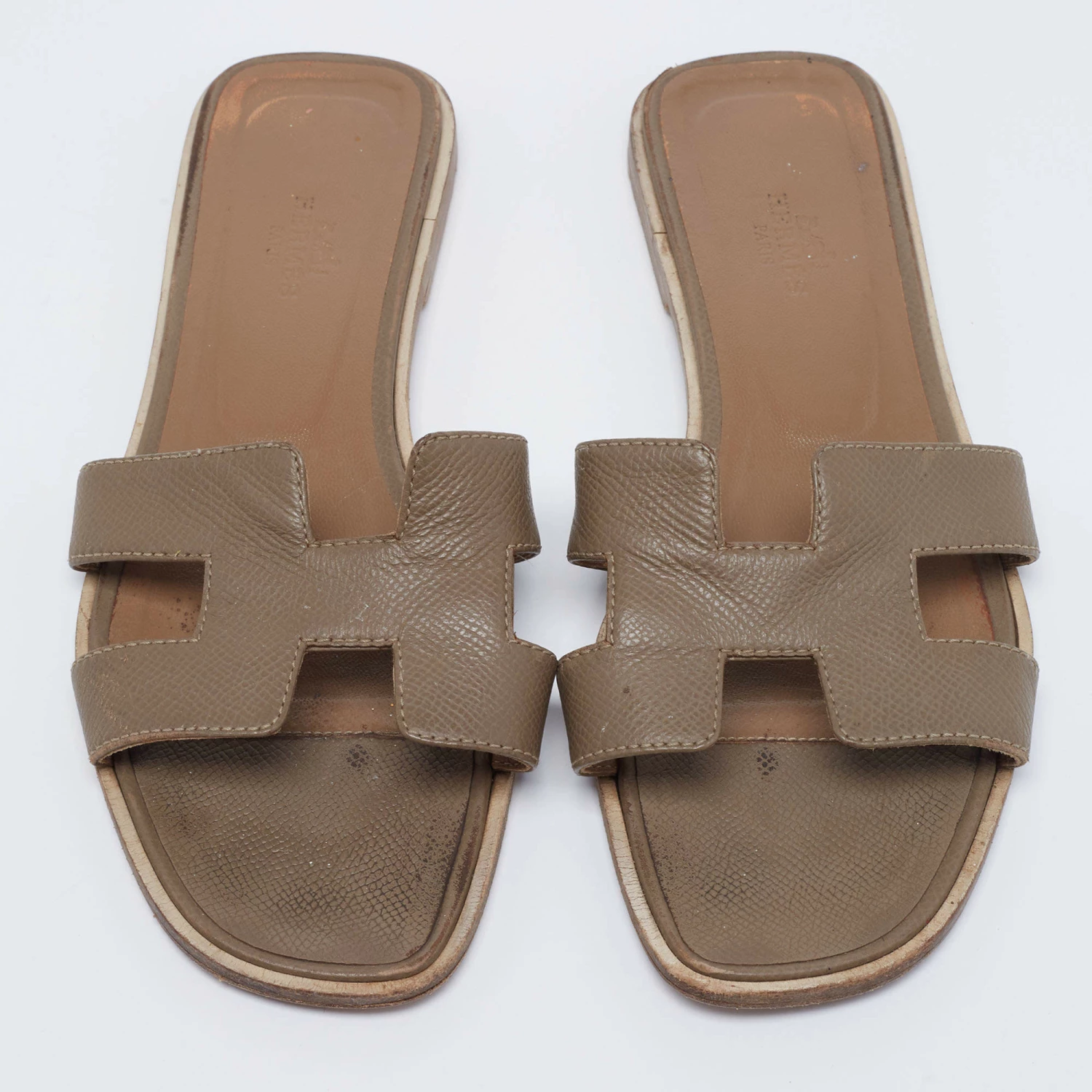 Add the iconic Hermès Oran sandals to your shoe collection with this pair. These olive green Oran flat sandals have been crafted in Italy using leather and they feature the iconic H on the vamps and lined insoles to provide comfort at every step.