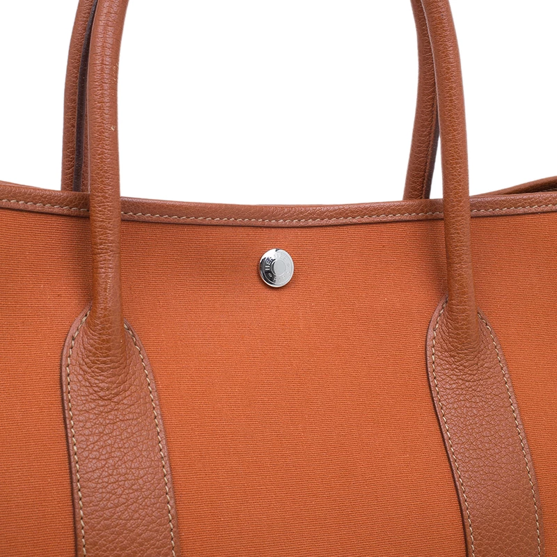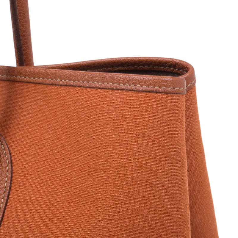 This Hermes Canvas Leather Tote is part of the elegant Garden Party collection. Crafted from orange canvas and lined with an orange leather trim, this bag is fun and practical. It features double rolled top handles, monogrammed stud closure in silver-tone hardware and additional studs on its sides to adjust the width of the bag. Its spacious interior is lined with orange canvas and has a leather base.