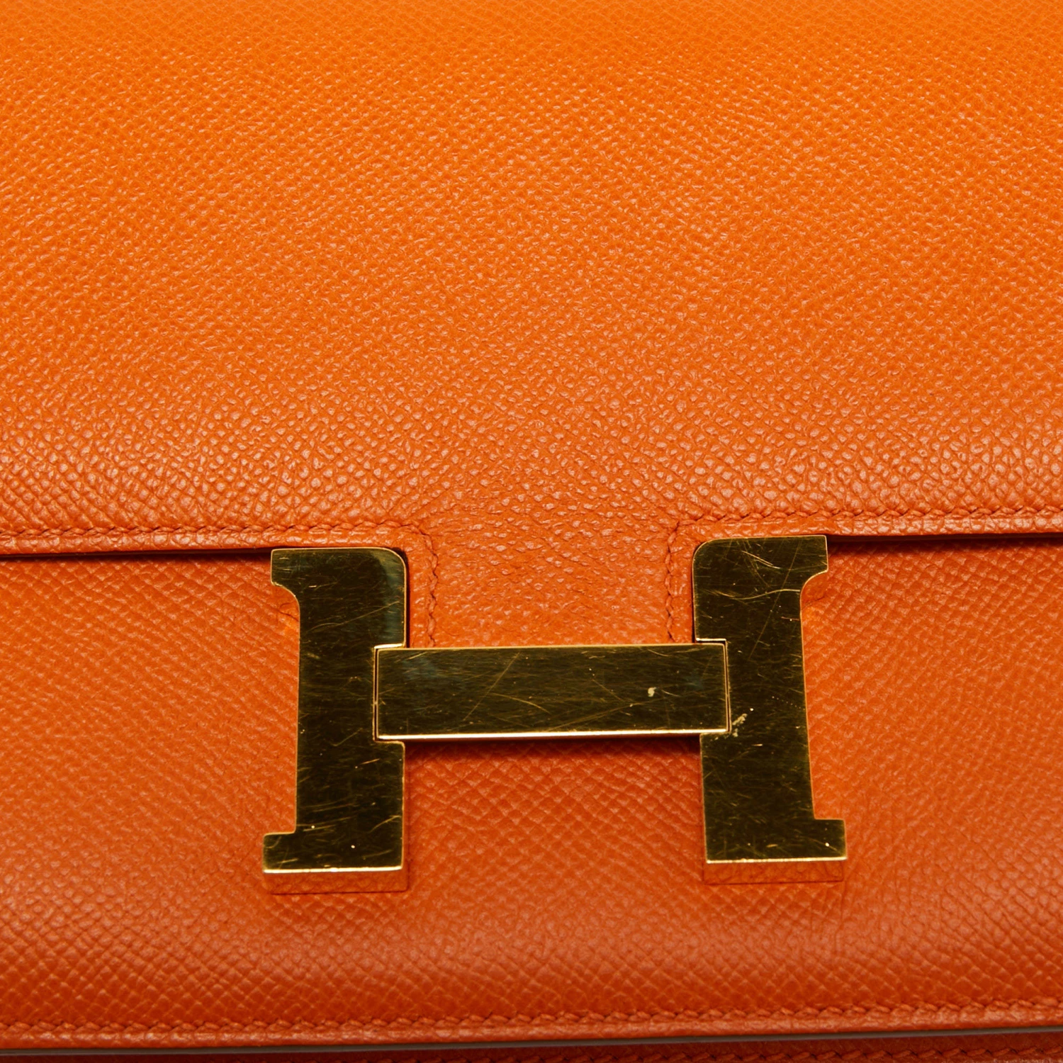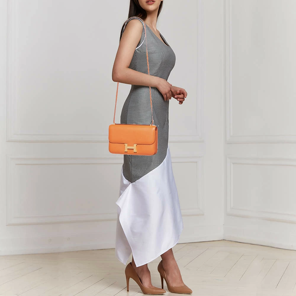 This Hermes Orange Constance Elan is crafted using Epsom leather and features the iconic H clasp on the front flap. The shoulder strap lets you carry it gracefully, and the fine finish of the sturdy silhouette projects a luxe look. Get this covetable piece for yourself today!