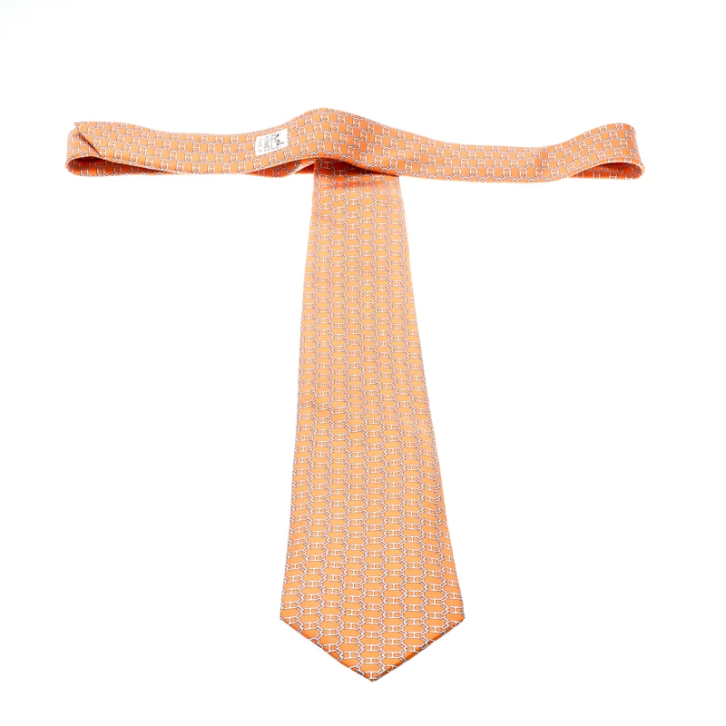 The classic chain-link printed silk tie makes for a versatile accessory. The Hermes tie has a pointed tip, a gorgeous orange hue and the brand label as a keeper loop. This tie is sober enough to be worn with formals yet cheerful enough to be worn without a jacket.