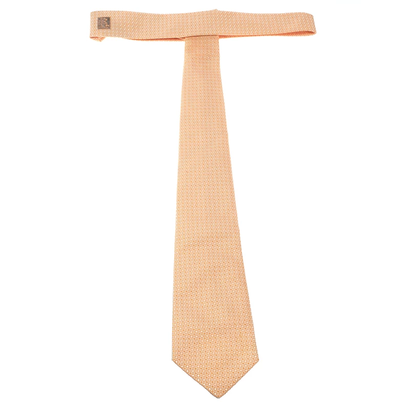 This lustrous tie from Hermes is cut from quality silk. Set in an orange jacquard expanse, the tie features a brand label keeper loop at the back. Team it up with formal attire for a sharp look.