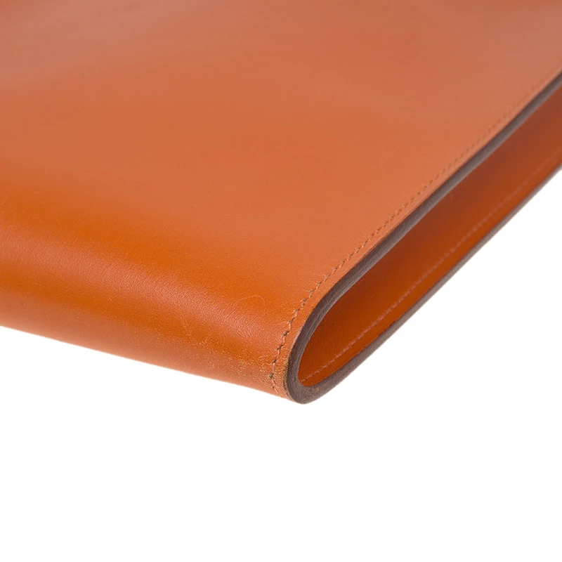 Hermès Leather Onimaitou Pochette is made of bright orange leather. Designed with single flat shoulder strap and an all over orange top stitch lines along with tonal suede lining. The open top pochette is your go-to style for everyday use.