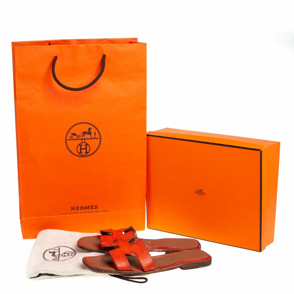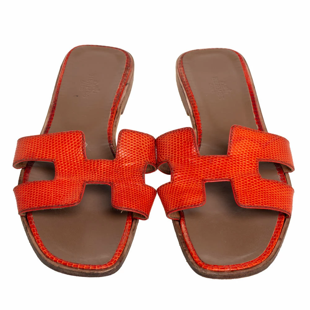 Put your best foot forward this season in these pretty Hermes slide sandals. These orange Oran sandals have been crafted from lizard leather in Italy and they feature the iconic H on the vamps as well as insoles meant to provide comfort at every step. These slides are sure to attract admirers! NOTE: AVAILABLE FOR UAE CUSTOMERS ONLY.