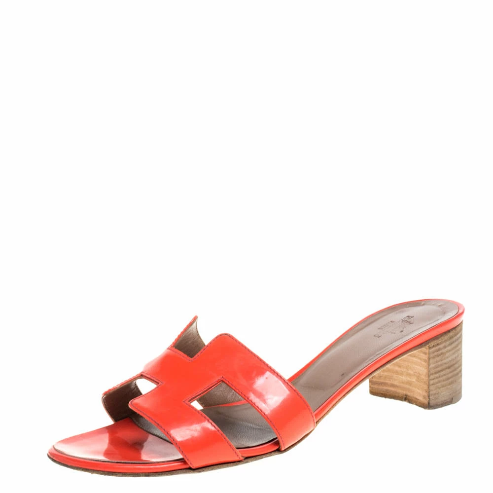 Comfort has a new look now! This pair of Oasis slides from the house of Hermes is designed to offer ease in the most luxurious way. Constructed with patent leather, the orange slides feature open toes, low block heels, and the signature H on the vamps.