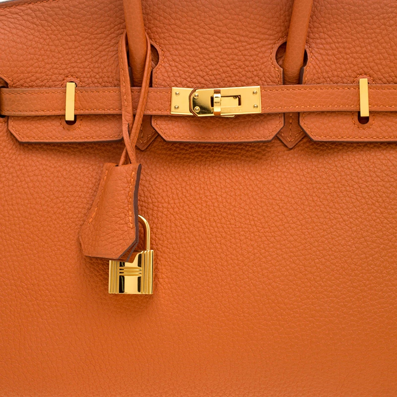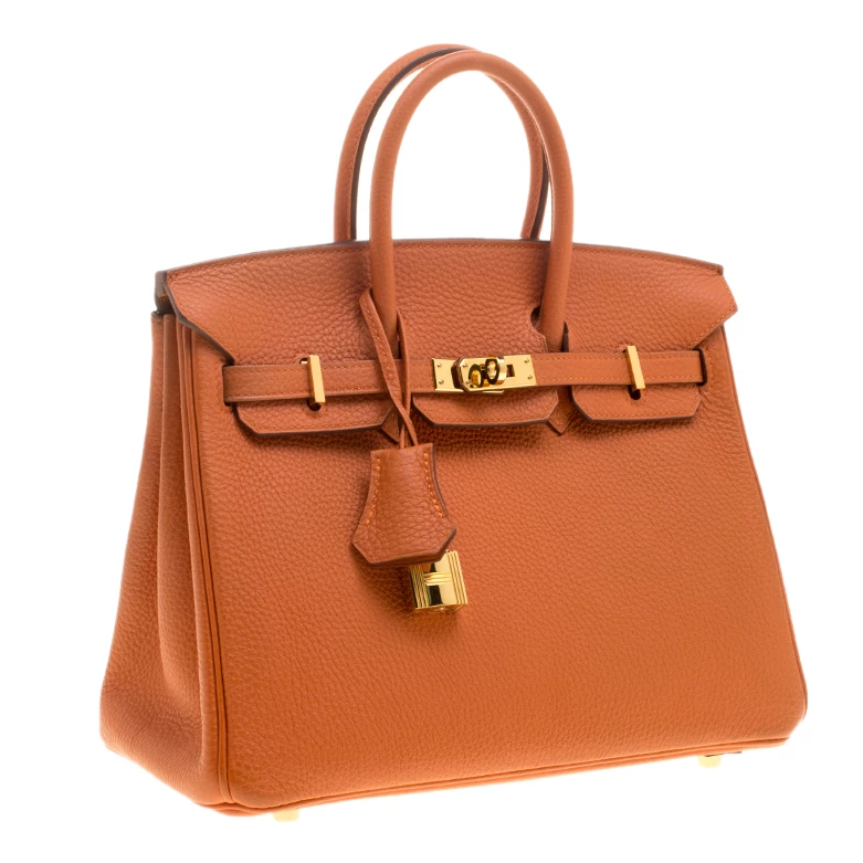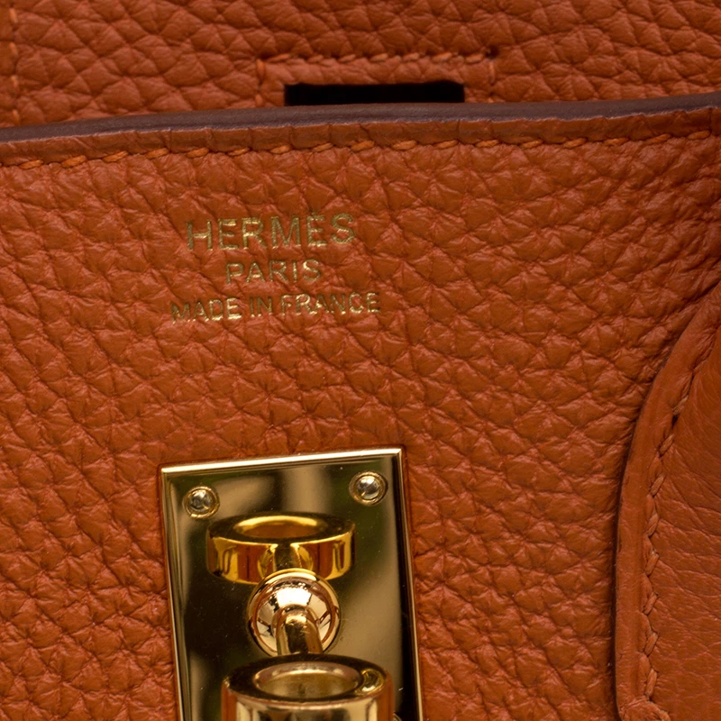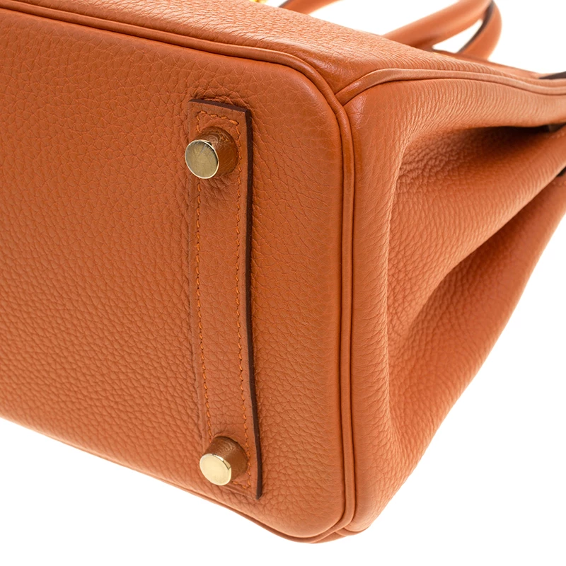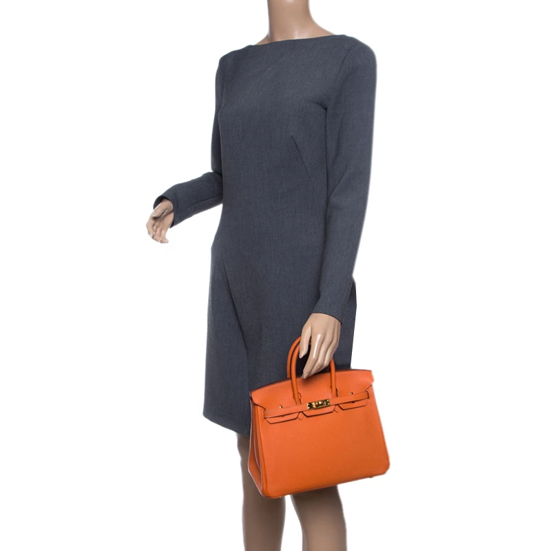 Hermes Birkin was inspired by Jane Birkin and is one of the most desired handbags in the world. Handcrafted from the highest quality of leather by skilled artisans, it takes over 18 hours of rigorous effort to stitch a Birkin together. Crafted in France from Orange Togo leather, the bag features dual top rolled handles and a padlock with its keys within the clochette. This bag comes with gold-tone hardware and has a spacious leather lined interior that will hold all your belongings. High quality and flawless craftsmanship are synonymous with Hermes. A timeless classic that never goes out of style the Birkin is a heritage that can last many years.