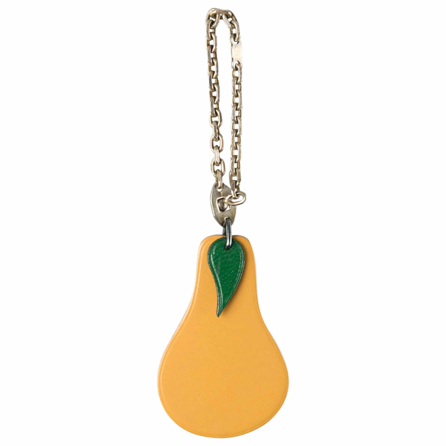 Introduce a fun style to your classic totes with this amazing bag charm from Hermes. Crafted from tan-colored leather into a pear shape, the charm is adorned with a green leaf motif for an ideal replication along with a silver chain attachment and a brand logo.