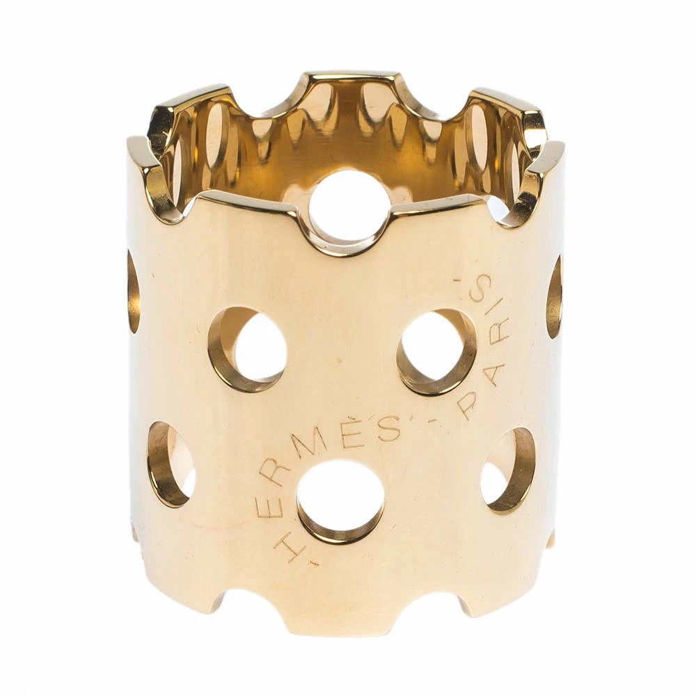Use this elegant and valuable piece by Hermes to secure your favorite scarf ties in style! The ring is crafted from permabrass and designed with perforated details. Replace the knot with this chic ring for a simpler and more fashionable look.