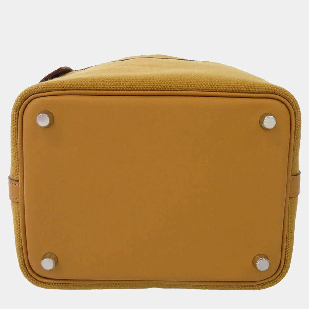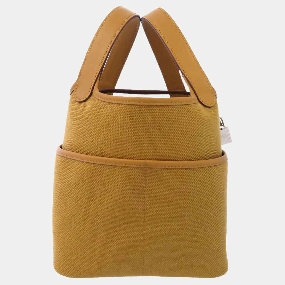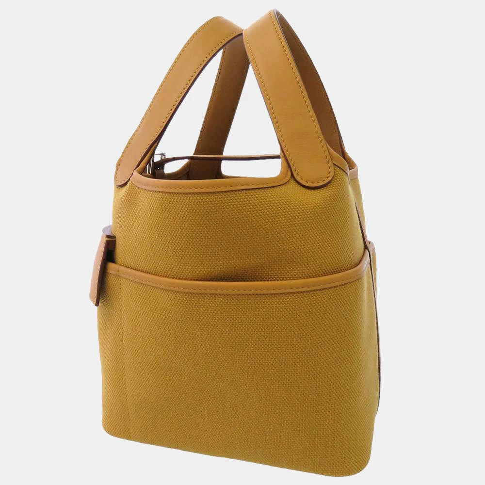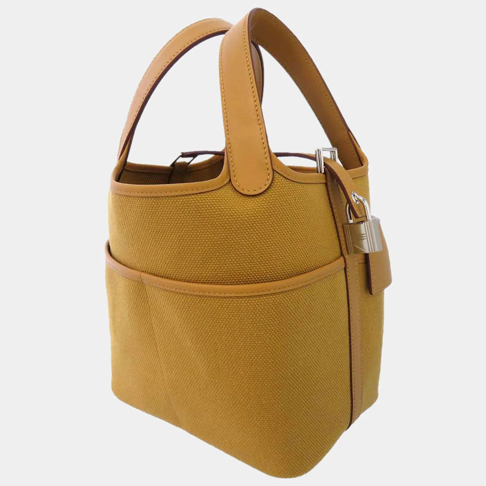 Channel your inner fashionista with this stylish Hermes Picotin bag. Crafted from Sésame Swift leather and Toile canvas, this charming bag features a distinctive streamlined silhouette with double leather top flat handles, a closure strap secured by a polished silver-tone padlock, and four stud feet to protect the bottom of the bag.