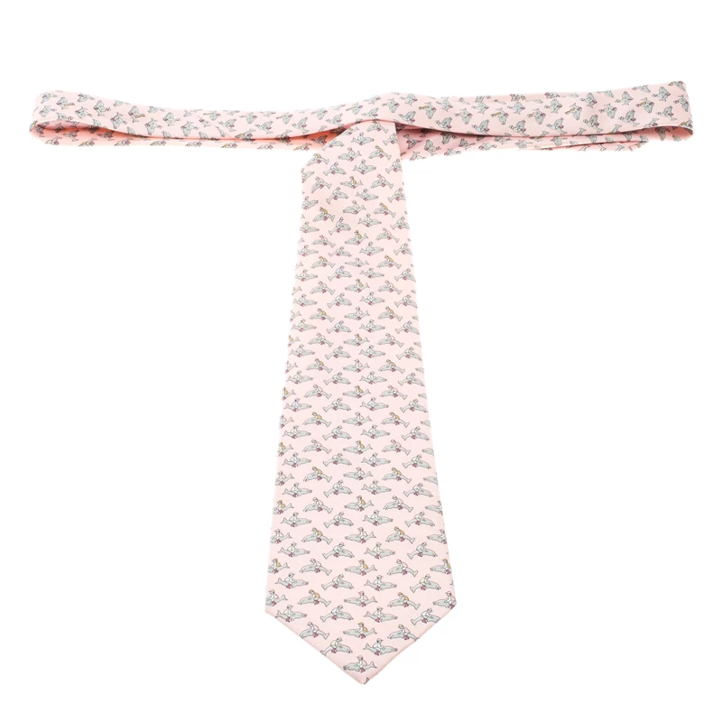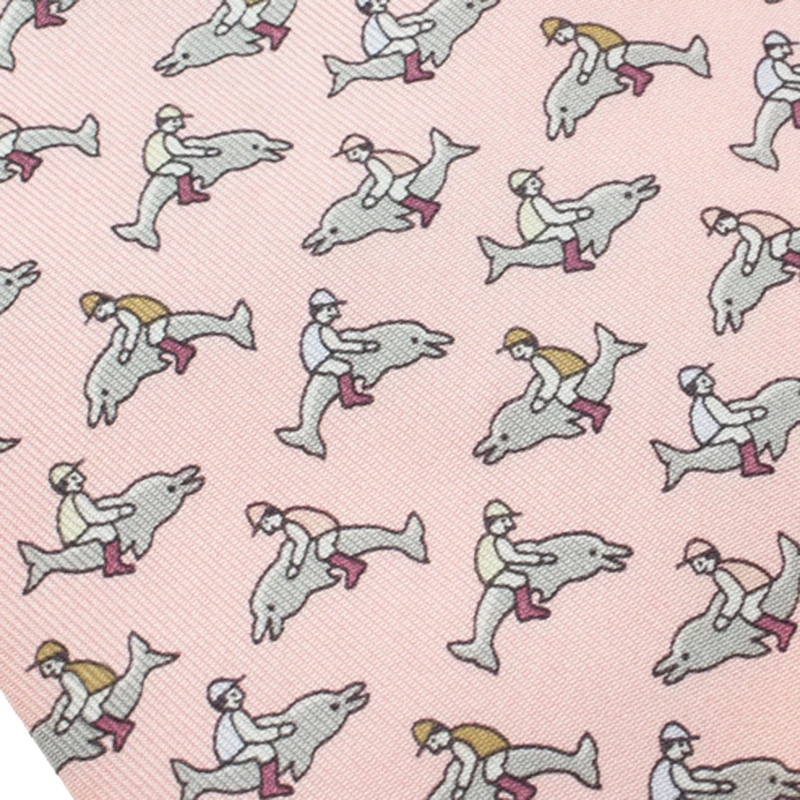 Designed with the most fun dolphin and a man print all over the surface, this pink silk Hermes tie will never fail to impress you and will always be a conversation started when you wear it. With a subtle detail of brand logo on the other end and a black strap to hold the back of the tie in place, this piece of accessory is a combination of modern chic and luxurious elegance.
