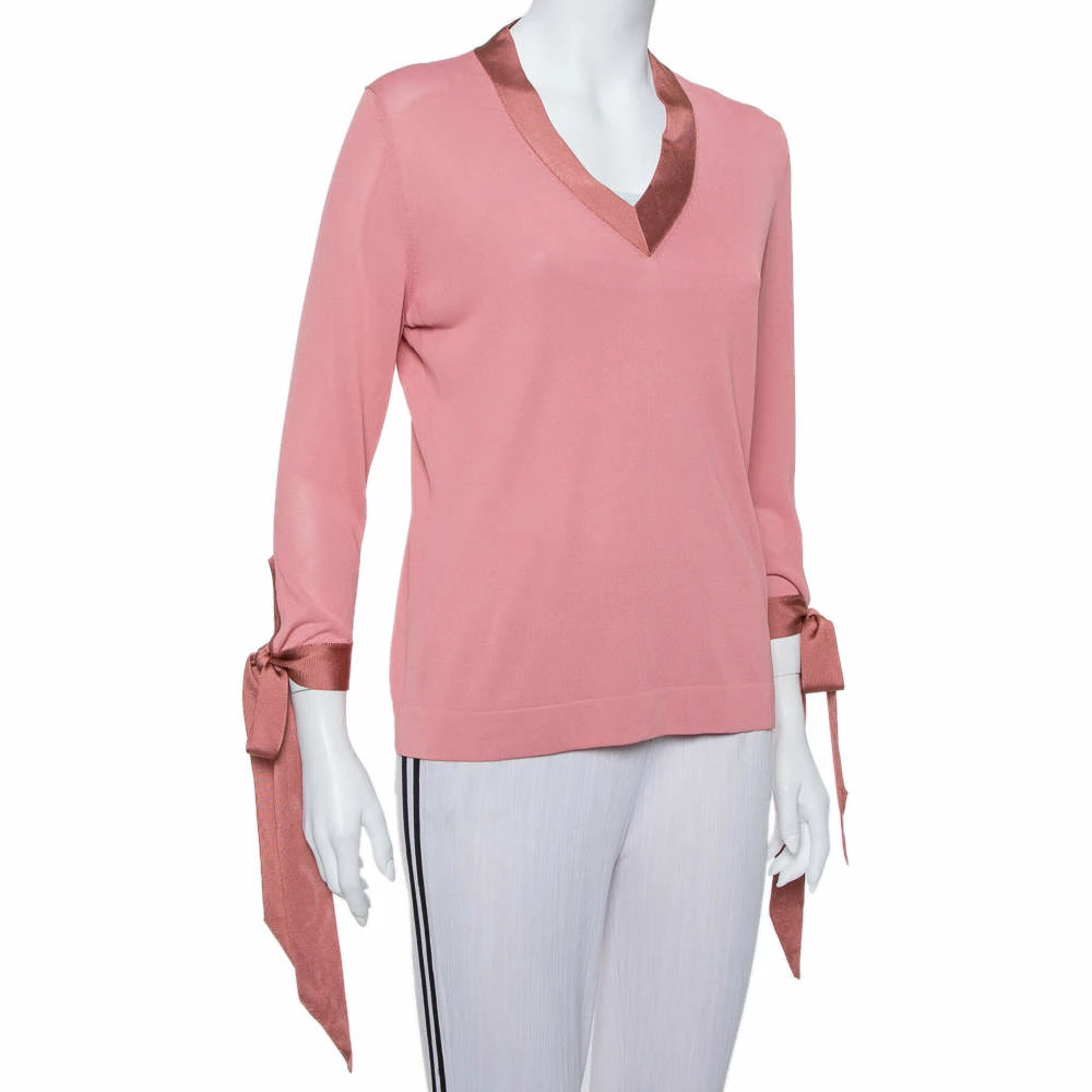 A blend of comfort and style, this Hermes top is exactly what one needs in a top. This striking pink creation features a V neckline and tie details on the sleeves. You can pair the top with pants as well as skirts.