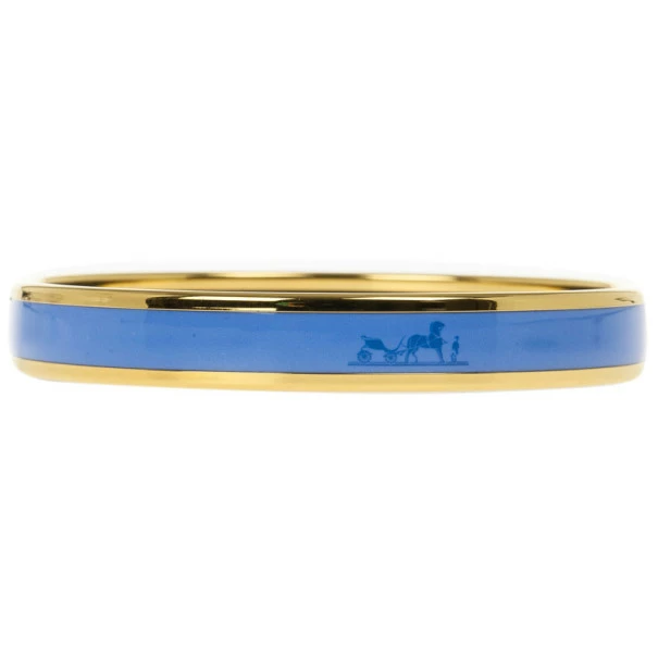 A beautiful and calm blue color, this Hermes bracelet will switch up your outfit. Part of the Printed Collection with a black Hermes logo, its combination of a cornflower blue shade and gold will add a metallic shine look to your outfit.Original Retail Price: US $485