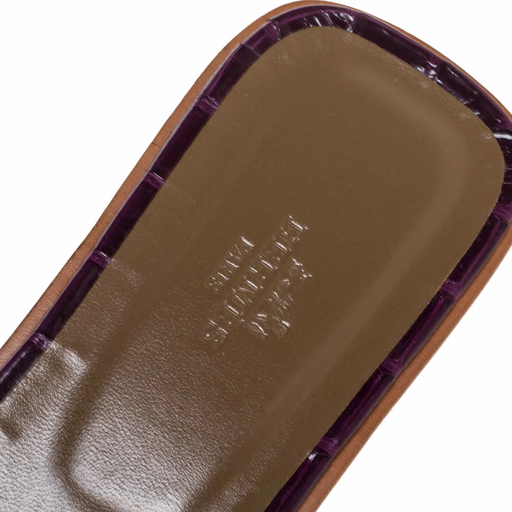 Put your best foot forward this season in these pretty Hermes sandals. These purple Oran sandals have been crafted from exotic alligator in Italy and they feature the iconic H on the vamps as well as insoles meant to provide comfort at every step. These shiny sandals are sure to attract admirers! (Available for UAE Customers Only)