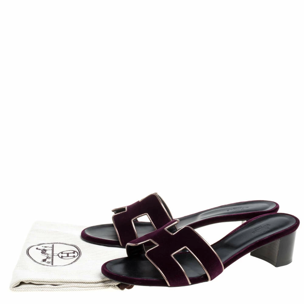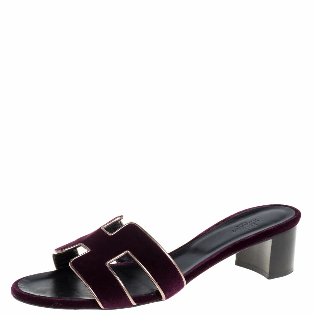 Crafted from soft velvet, these Oasis slide sandals from Hermes are classy and comfortable with 5 cm block heels. These slides feature the signature H-shaped straps on the front. The insoles are lined with leather and carry the brand labels.