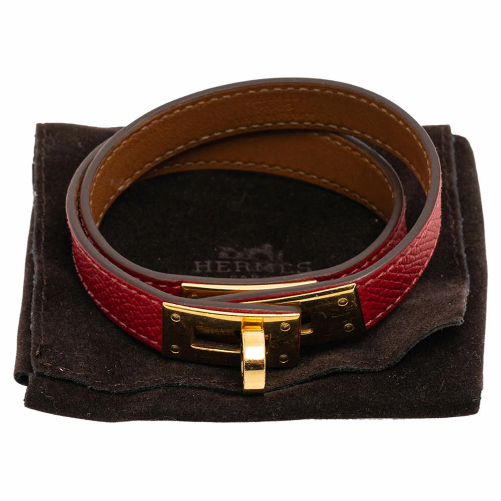 This Hermes Double Tour wrap bracelet is a chic accessory that can be paired with everything, from causals to evening outfits. Crafted from Epsom leather in a classic red shade, it is beautified with a Kelly twist closure in gold-plated metal. The bracelet has a long strap that wraps twice around your wrist.