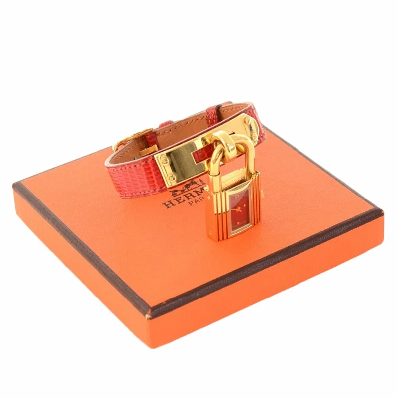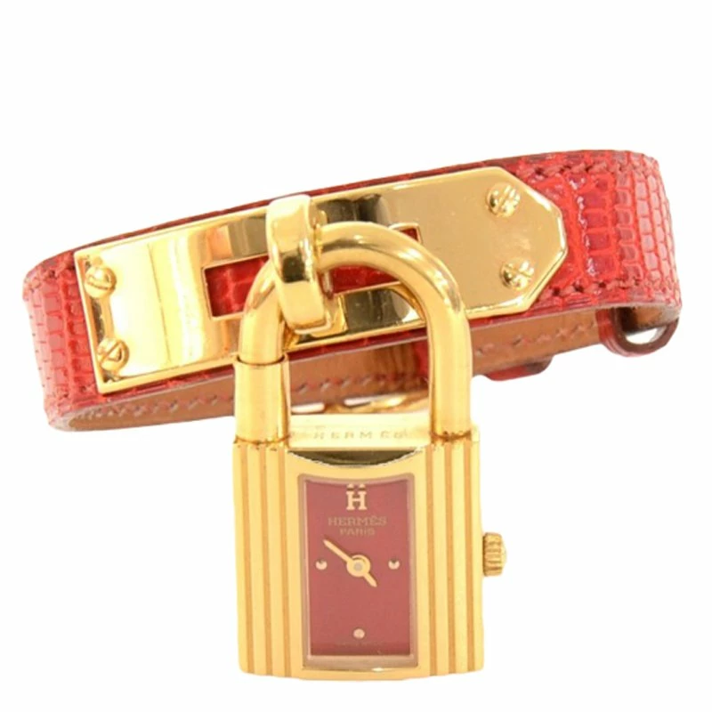 This playful wristwatch by the luxurious Hermes label is the go-to accessory when you’re looking to spice up an outfit. This handbag inspired watch takes its padlock design from the coveted Hermes Kelly. Equipped with a red leather strap, this quartz timepiece is protected with sapphire glass and closes on the wrist with a buckle closure.