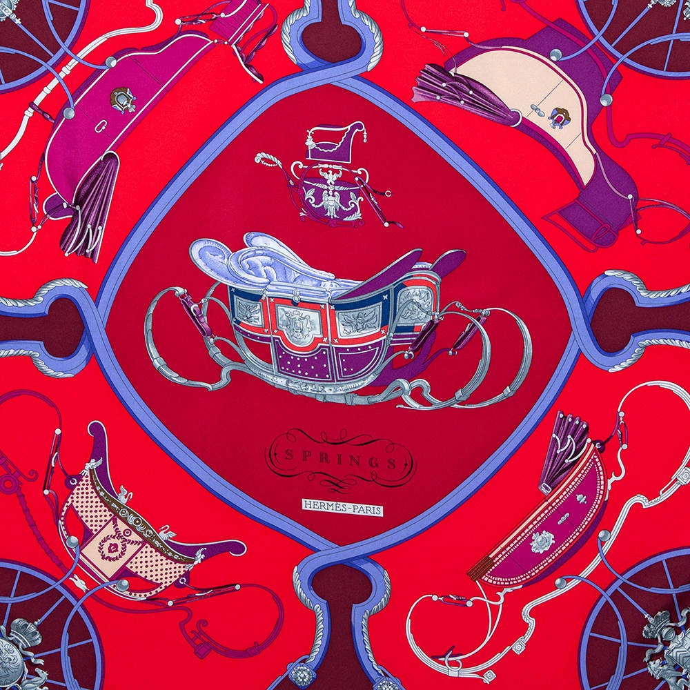 This Hermes Springs square scarf crafted in silk can be styled as a head accessory or tied around the neck. The square scarf exhibits unique prints, the brand’s signature, and hand-rolled edges.