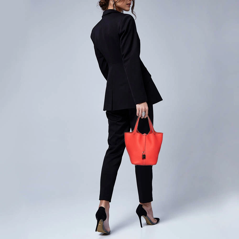Wonderfully crafted from Clemence leather, this Picotin from Hermes is a creation for people who love a blend of luxury and style. It comes in a grand color and it sits in a relaxed shape with two handles and a leather interior. Armed with protective metal feet as a finishing touch, this bag is ideal for everyday usage.