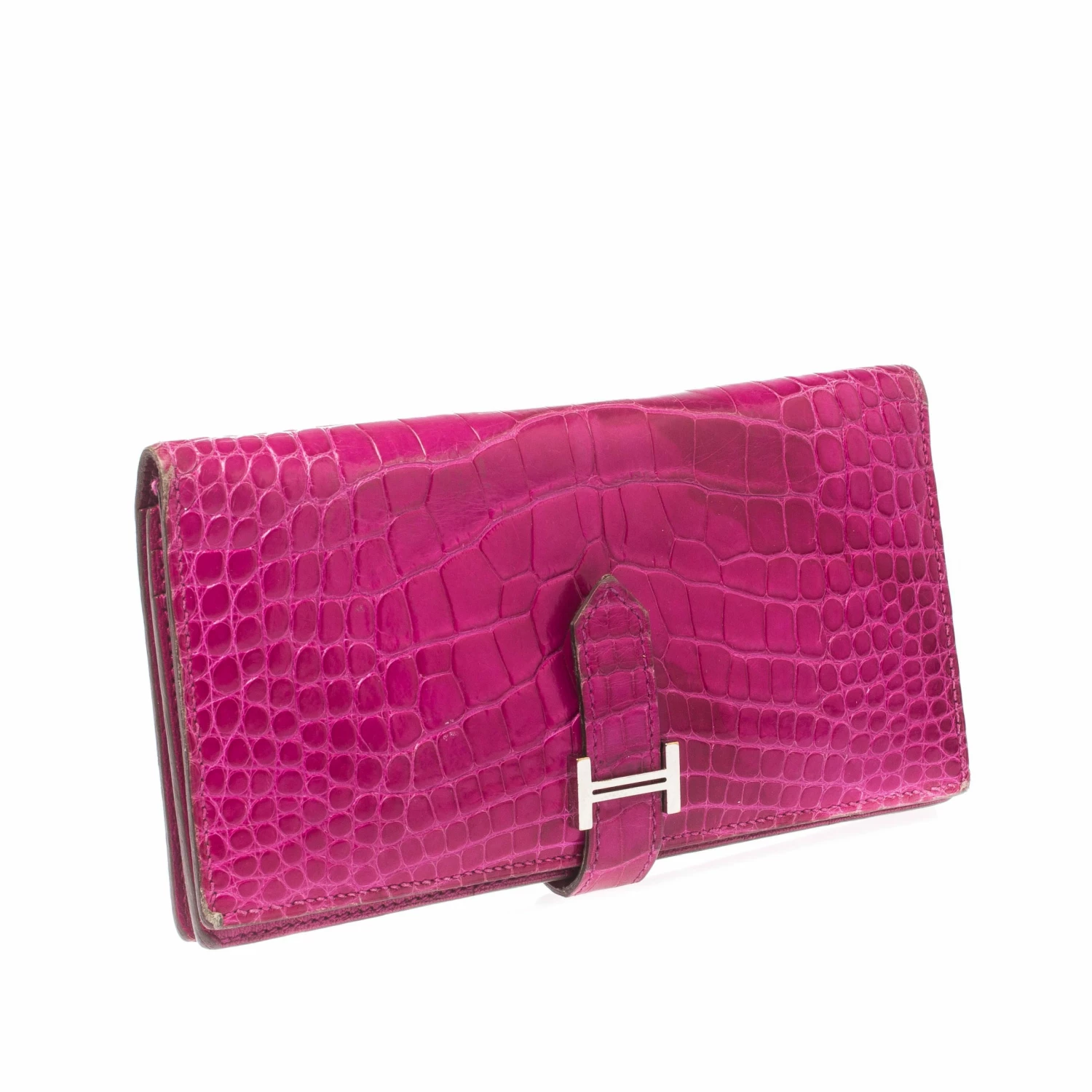 Luxuriously crafted by the experts at Hermes, this stunning Bearn Gusset wallet is a must have accessory for the luxury fashion lovers. Crafted in rose exotic alligator skin, this wallet carries an elegant appeal and a sleek silhouette. It features a silver-tone H on the front strap button closure that opens to a matching leather-lined interior to complete the look. The interior is composed of multiple card slots, one slip and one zip pocket where you can conveniently store your cards, cash and bills. This wallet is a charmer that can be carried solo in the hand and can be stowed easily in one of the brand’s luxury bags.