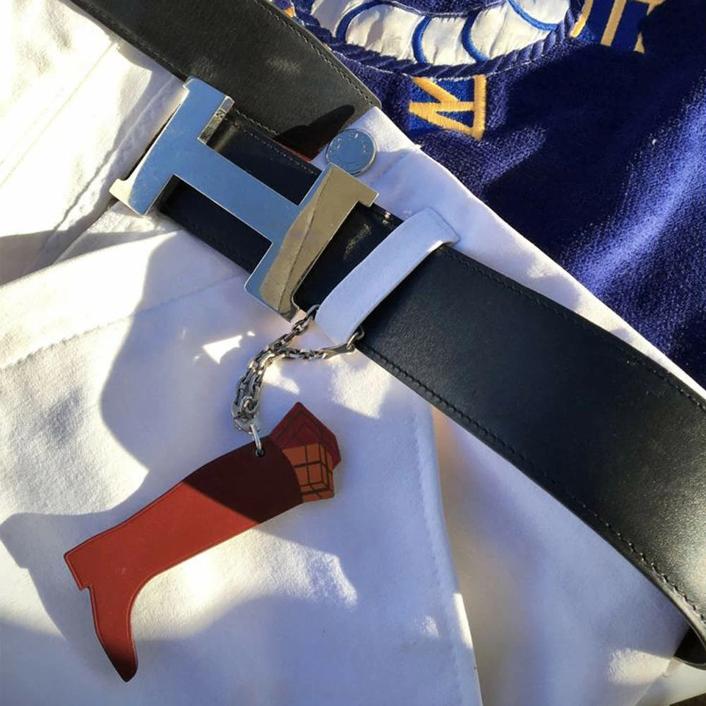 Add a note of individual flair to your bags or belts with this eye-catching Hermes charm. Crafted from metal and rendered in a lovely rouge color, this charming piece features a leather boot and comes with a silver chain.