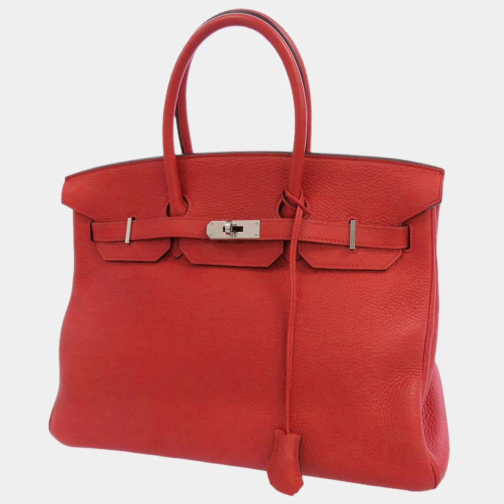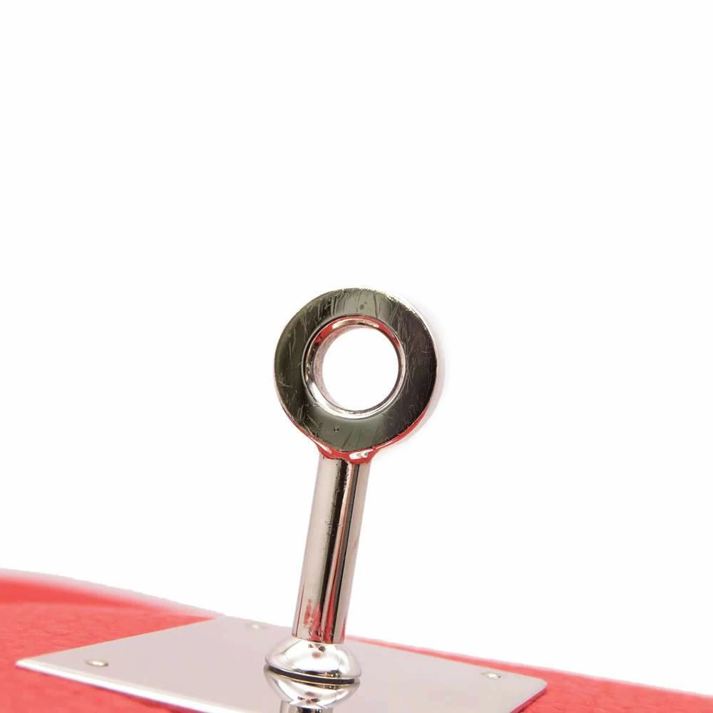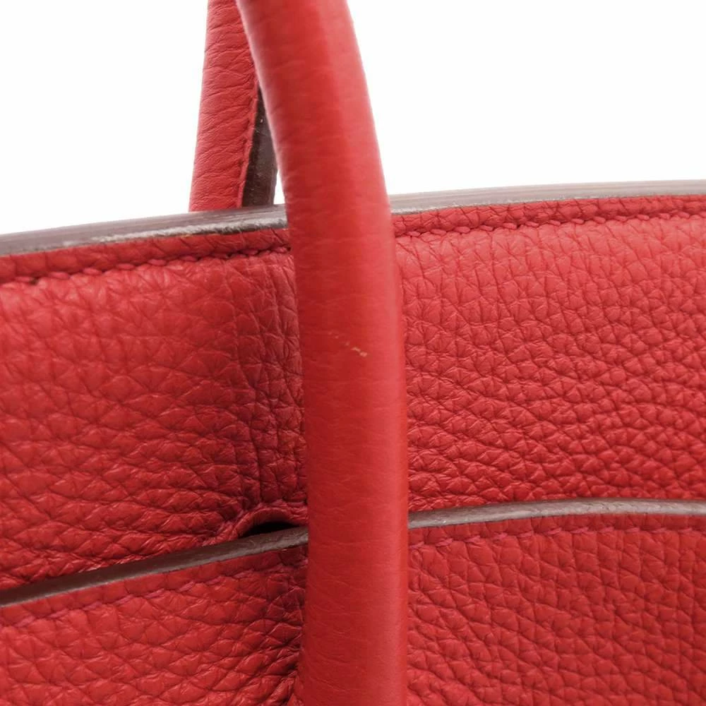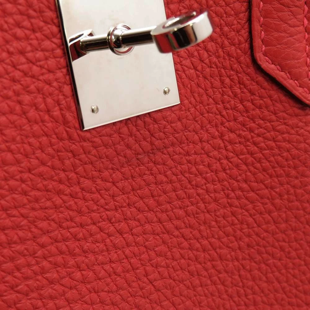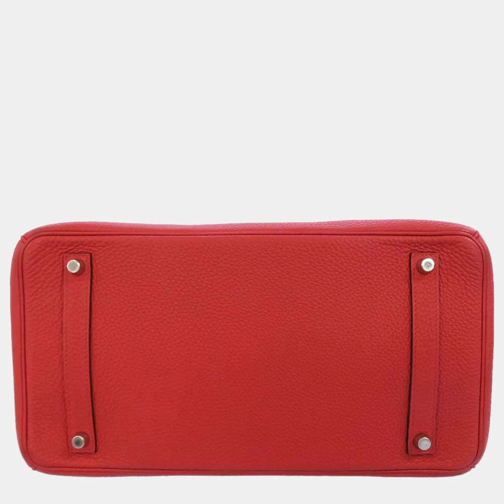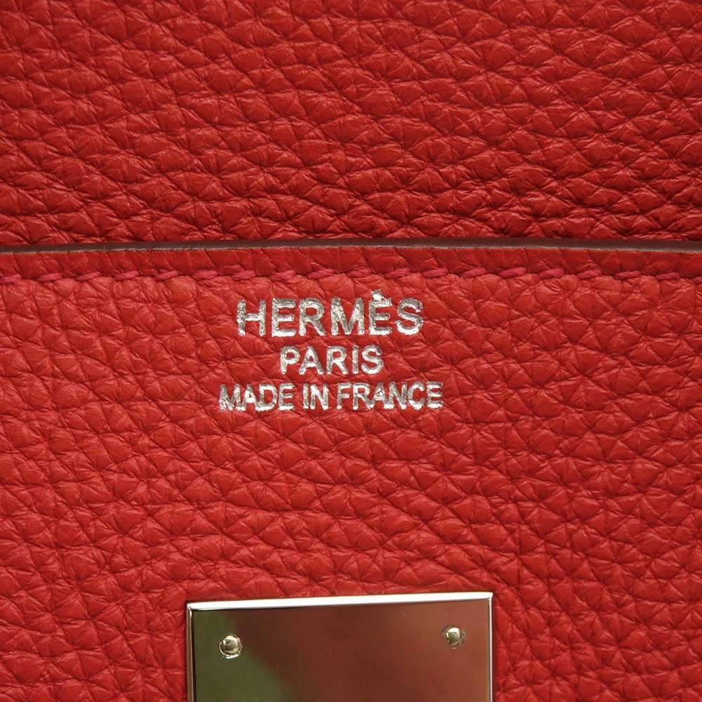 Infuse luxurious sophistication into your ensembles with this stylish Hermes Birkin bag. Crafted from Rouge Casaque Taurillon Clemence leather, this attractive bag is characterized by dual-rolled handles, palladium hardware, toggle closure with lock and two keys, and spacious interiors.