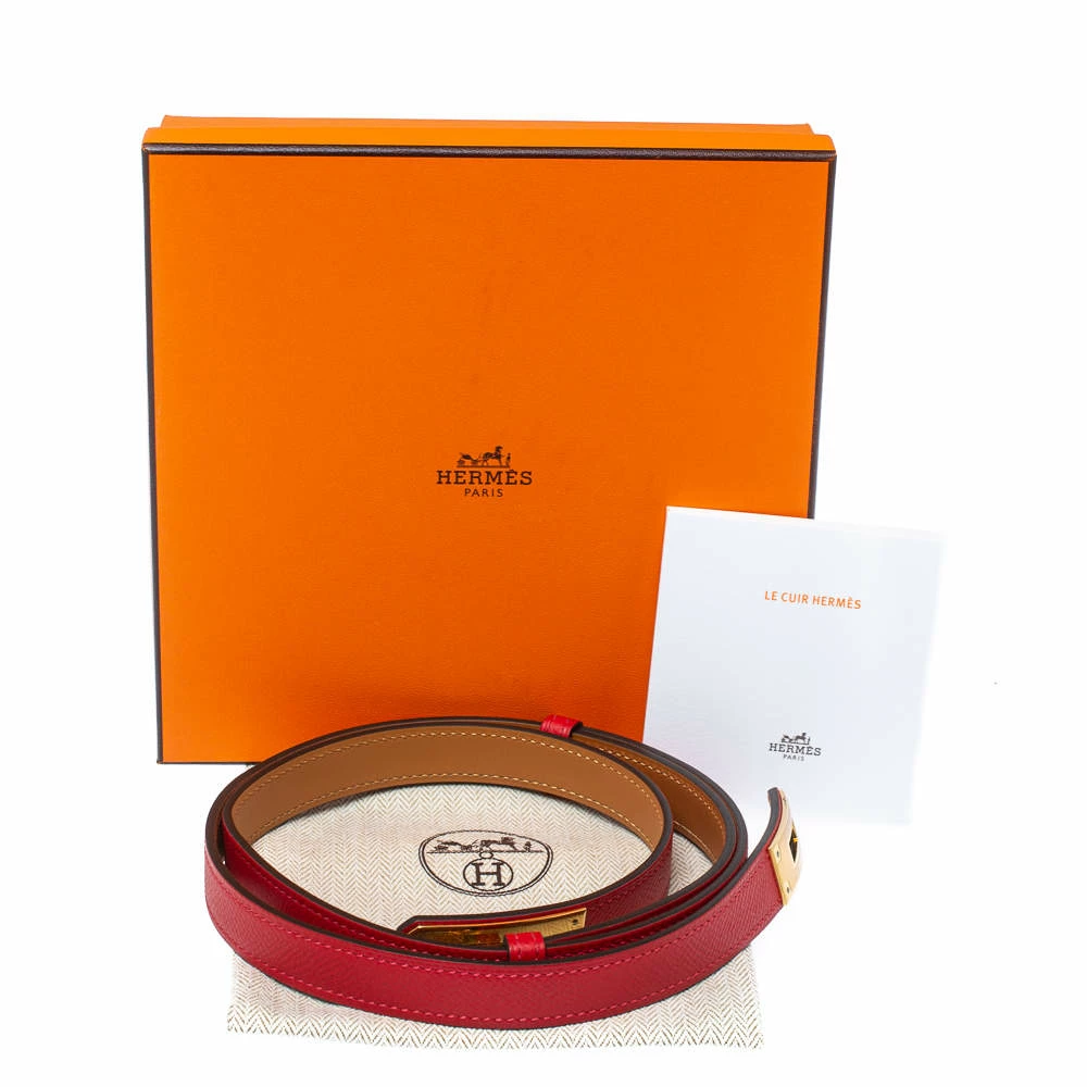 Complete any ensemble with a touch of luxurious fashion by flaunting this beauty of a belt from Hermes. It is crafted from red Epsom leather and detailed with the signature Kelly lock in gold-tone. The belt will look great with high waist dresses and tulle skirts.