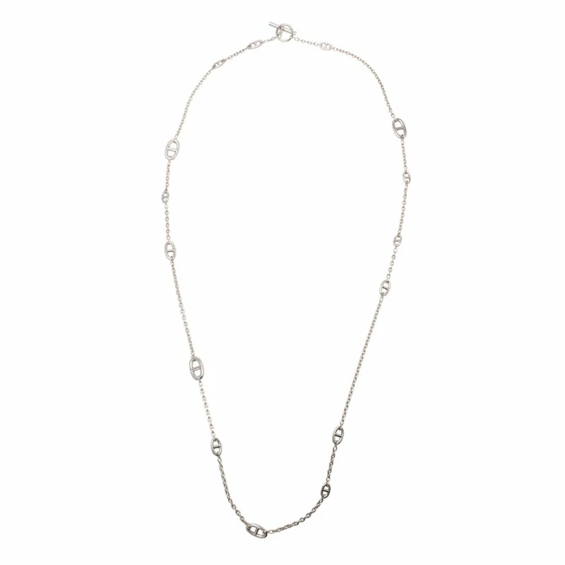 This Farandole necklace is from Hermes’ nautical-inspired ‘Chain d’Ancre collection.’ The collection was specifically designed to reflect the elegance of a boat’s chain-link line to its anchor. Structured as a double layered rope necklace, this silver Farandole is secured by a toggle clasp.