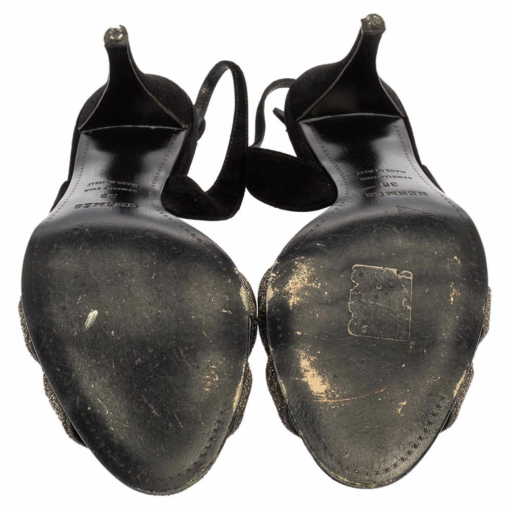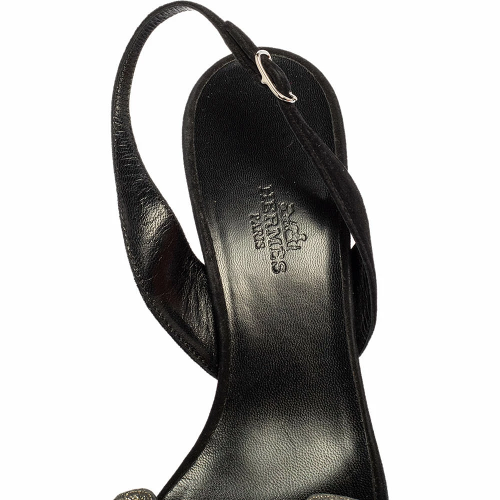Crafted from black suede, these Night sandals from Hermes are classy and comfortable with their 7 cm heels. These slingback sandals feature the signature H-shaped glitter straps on the front. The insoles are lined with leather and carry the brand logo details.